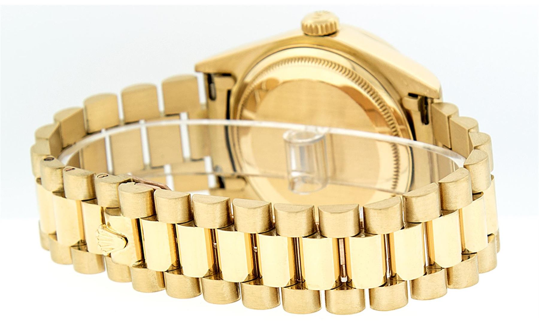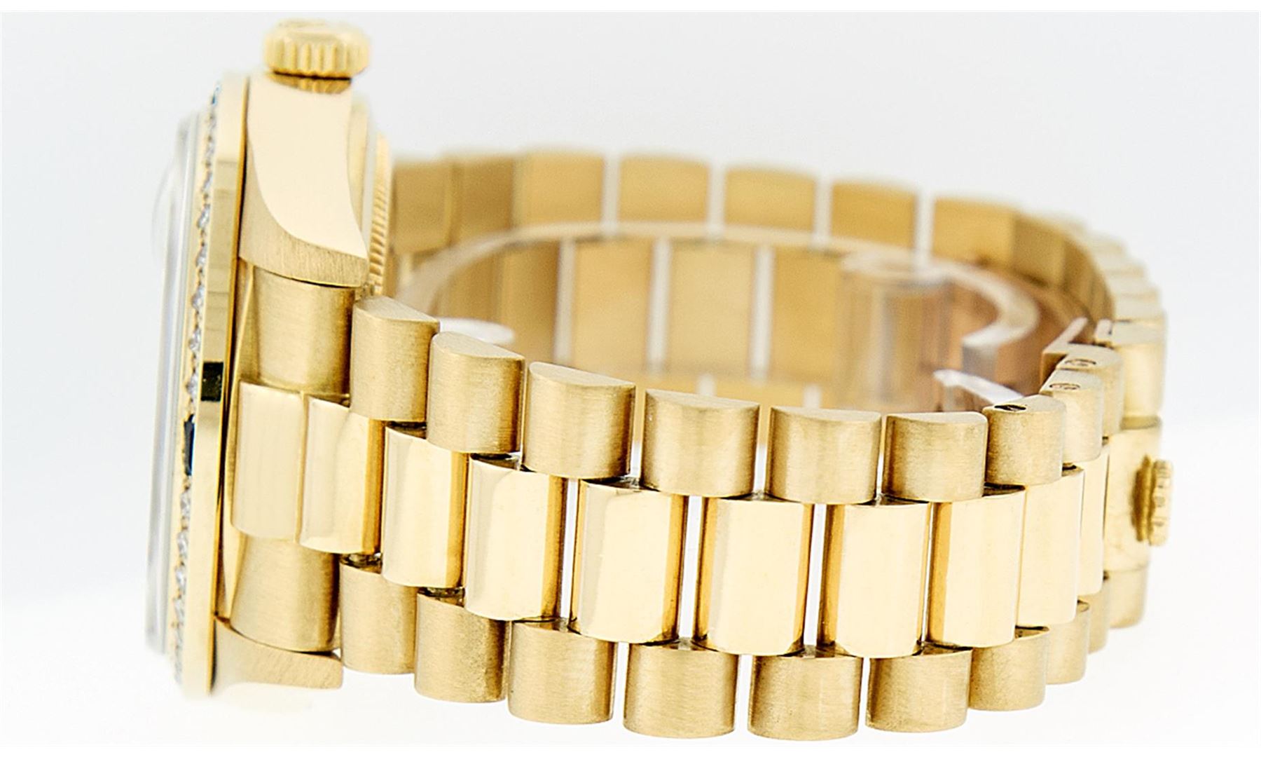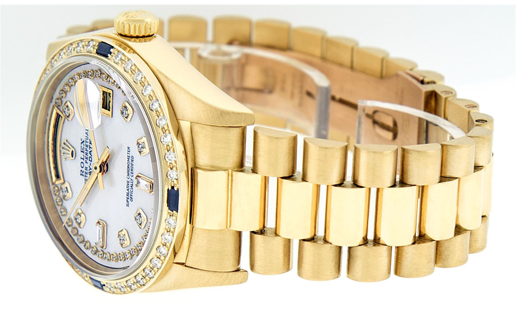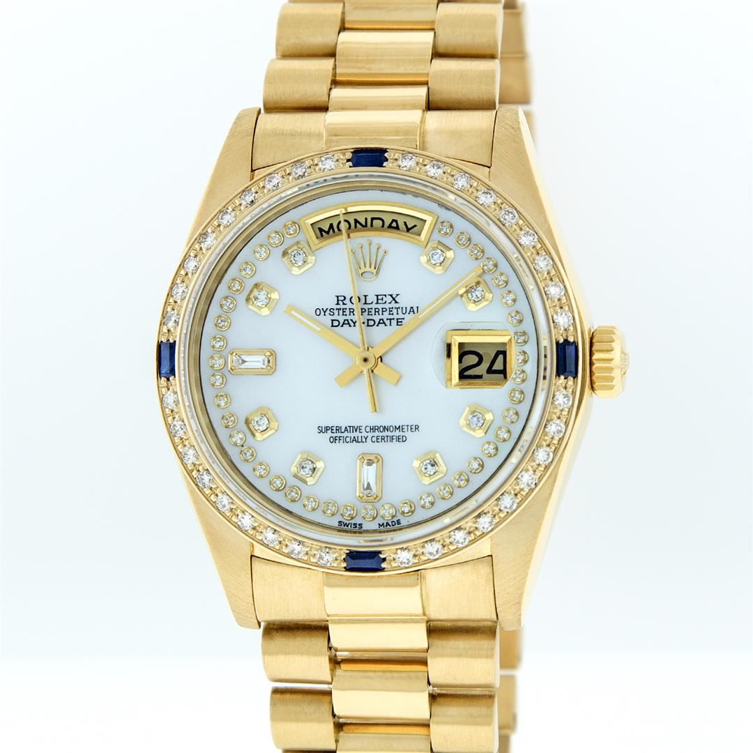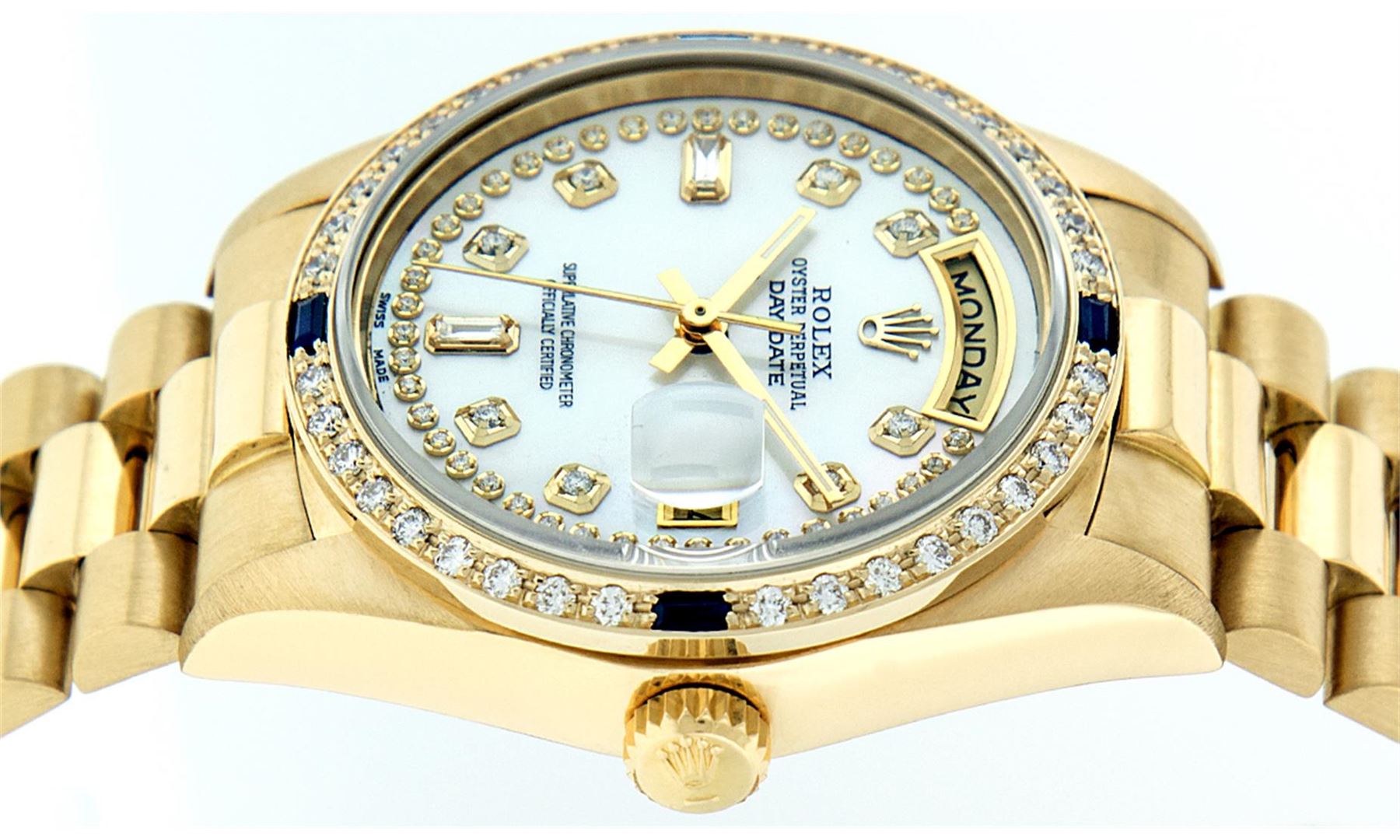 One Mens Rolex Day Date 18K Yellow Gold President Polished, Serviced & Electronically Tested, 18K Yellow Gold Case:36mm, 18K Yellow Gold Crown, Custom Bezel: 18K Yellow Gold Sapphire Beadset Diamond Bezel, Diamond + Gem Count: 36 Diamonds + 4 Sapphires, Total Weight 1.00 Carat, Clarity: SI-VS, Color: G to H. Custom Crystal: Synthetic Sapphire Cyclops Lens. Movement: Automatic Winding Movement Caliber 3055. Custom Dial: Mother Of Pearl String Diamond Dial With 2 Baguettes, (49 Diamond In Dial + 2 Baguette Diamonds In Dial) G To H In Color, Clarity: SI-VS. Date Window: 3 O'Clock Position Date Display, Day Window: 12 O'Clock Position Date Display. Single Quickset, Model: Day Date President. Condition: G-6 Extra Fine. Bracelet: 18K Yellow Gold President. Bright Polish. 7.0 Inch Length, Standard Hidden President Clasp President Band, With Rolex Logo.