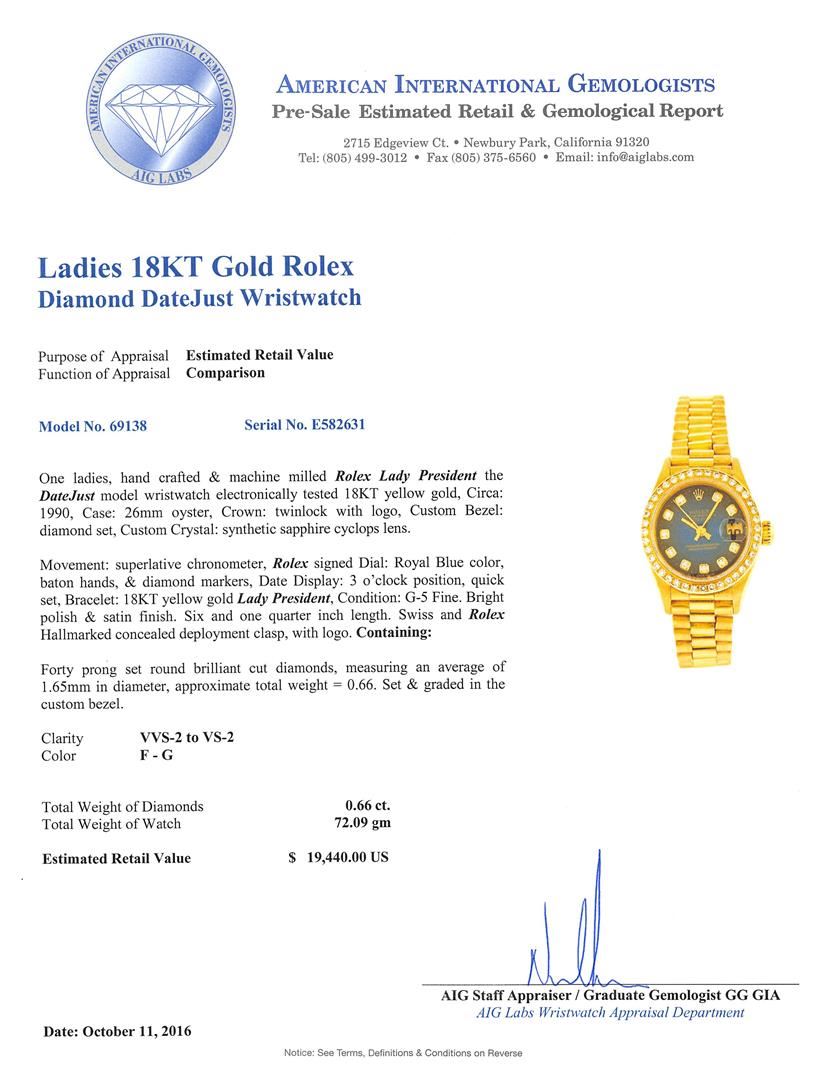 One ladies, hand crafted & machine milled Rolex Lady President the DateJust model wristwatch electronically tested 18KT yellow gold, Circa: 1990, Case: 26mm oyster, Crown: twinlock with logo, Custom Bezel: diamond set, Custom Crystal: synthetic sapphire cyclops lens. Movement: superlative chronometer, Rolex signed Dial: Royal Blue color, baton hands, & diamond markers, Date Display: 3 o'clock position, quick set, Bracelet: 18KT yellow gold Lady President, Condition: G-5 Fine. Bright polish & satin finish. Six and one quarter inch length. Swiss and Rolex Hallmarked concealed deployment clasp, with logo. Containing: Forty prong set round brilliant cut diamonds, measuring an average of 1.65mm in diameter, approximate total weight = 0.66. Set & graded in the custom bezel. Clarity VVS-2 to VS-2 Color F - G. Total Weight of Diamonds 0.66ct. Total Weight of Watch 72.09gm. AIG Appraised at $19,440.00.