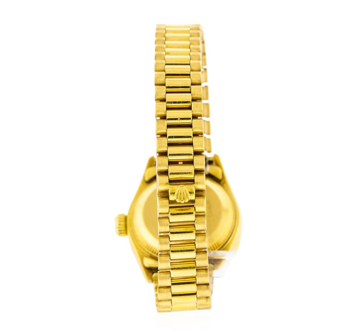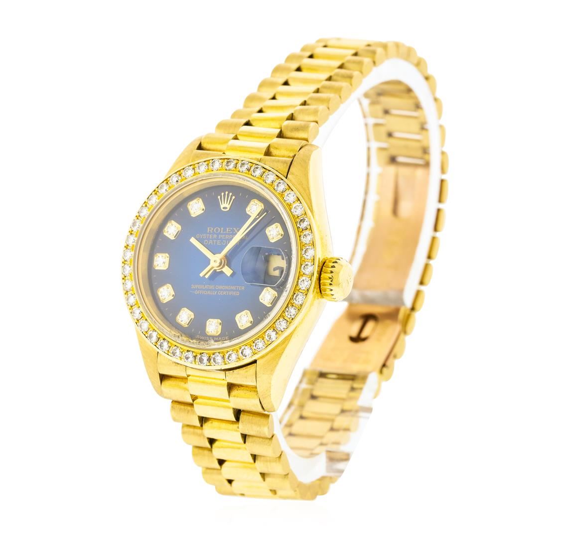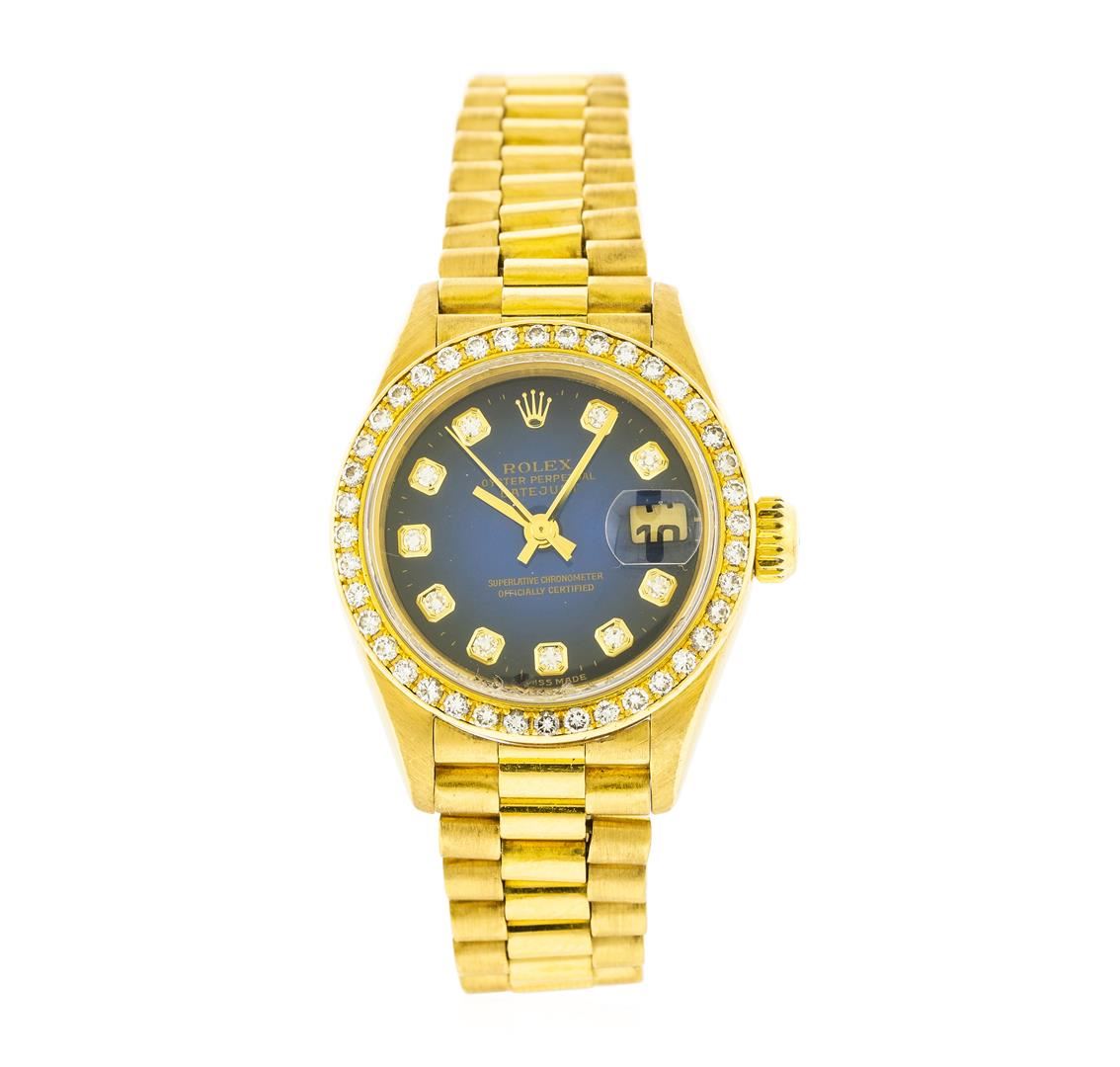 One ladies, hand crafted & machine milled Rolex Lady President the DateJust model wristwatch electronically tested 18KT yellow gold, Circa: 1990, Case: 26mm oyster, Crown: twinlock with logo, Custom Bezel: diamond set, Custom Crystal: synthetic sapphire cyclops lens. Movement: superlative chronometer, Rolex signed Dial: Royal Blue color, baton hands, & diamond markers, Date Display: 3 o'clock position, quick set, Bracelet: 18KT yellow gold Lady President, Condition: G-5 Fine. Bright polish & satin finish. Six and one quarter inch length. Swiss and Rolex Hallmarked concealed deployment clasp, with logo. Containing: Forty prong set round brilliant cut diamonds, measuring an average of 1.65mm in diameter, approximate total weight = 0.66. Set & graded in the custom bezel. Clarity VVS-2 to VS-2 Color F - G. Total Weight of Diamonds 0.66ct. Total Weight of Watch 72.09gm. AIG Appraised at $19,440.00.