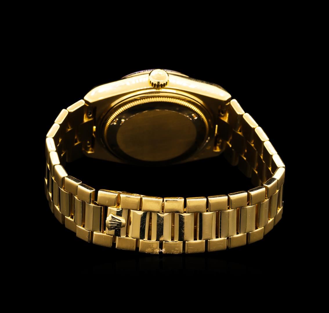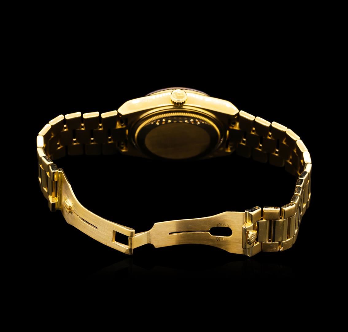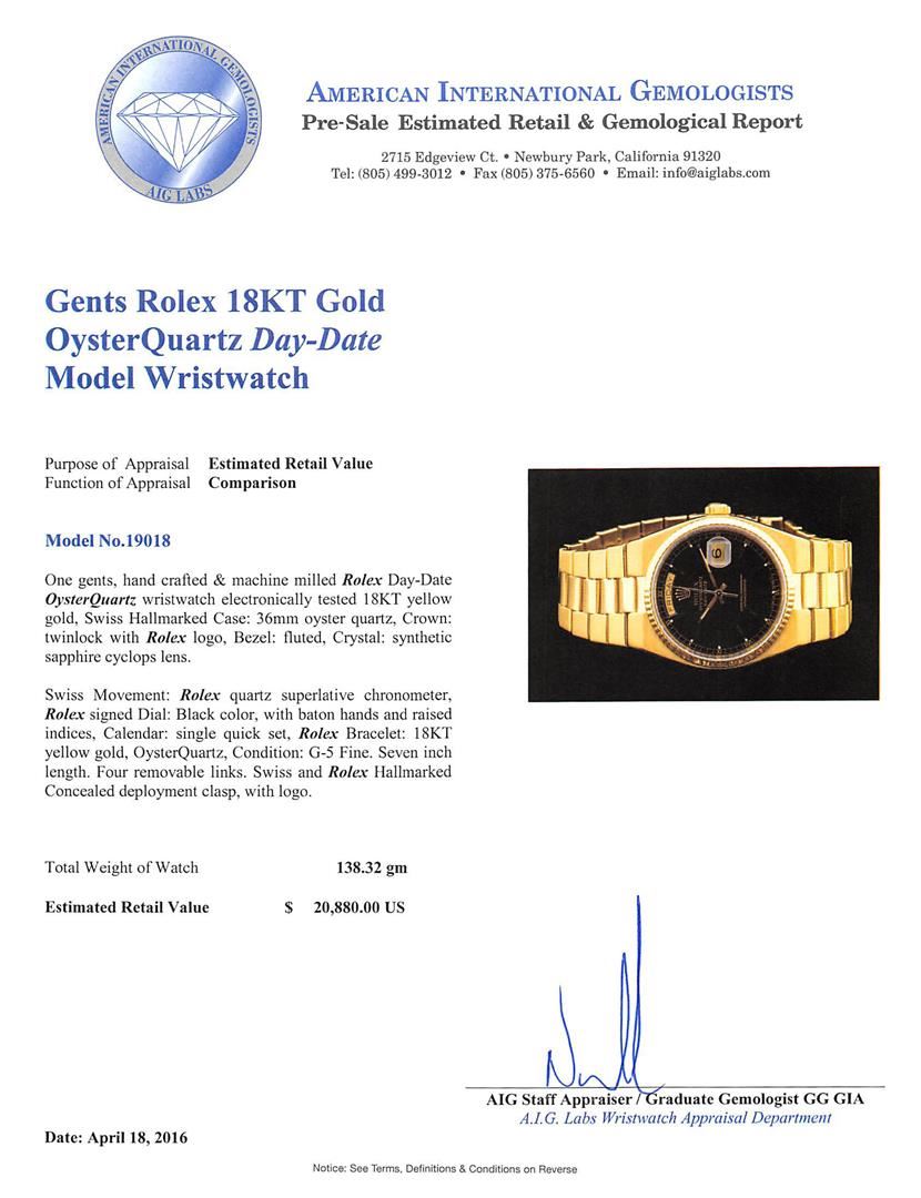 One gents, hand crafted & machine milled Rolex Day-Date OysterQuartz wristwatch electronically tested 18KT yellow gold, Swiss Hallmarked Case: 36mm oyster quartz, Crown: twinlock with Rolex logo, Bezel: fluted, Crystal: synthetic sapphire cyclops lens. Swiss Movement: Rolex quartz superlative chronometer, Rolex signed Dial: Black color, with baton hands and raised indices, Calendar: single quick set, Rolex Bracelet: 18KT yellow gold, OysterQuartz, Condition: G-5 Fine. Seven inch length. Four removable links. Swiss and Rolex Hallmarked Concealed deployment clasp, with logo. Total Weight of Watch 138.32gm. AIG Appraised at $20,880.00.