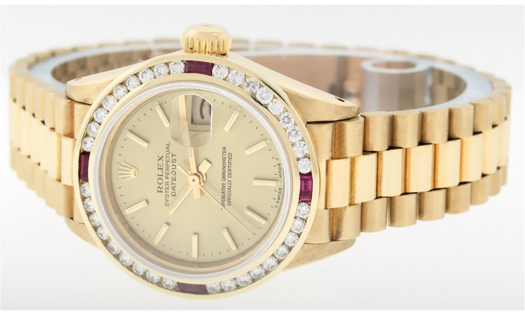 One Ladies 18K Yellow Gold Rolex President Polished, Serviced & Electronically Tested, 18K Yellow Gold Case: 26mm, 18K Yellow Gold Crown, Custom Bezel: 18K Yellow Gold Ruby Channel-Set Diamond Bezel, Diamond + Stone Count: 36 Diamonds + 4 Rubies. Total Weight 1.00 Carat, Clarity: SI-VS, Color: G to H. Custom Crystal: Synthetic Sapphire Cyclops Lens. Movement: Automatic Winding Movement Caliber 2030. Dial: Champagne Index Dial With Line Track & Lumi Dots. Date Window: 3 O'Clock Position, Model: President, Condition: G-6 Extra Fine The Watch Is In Very Good Condition Free Of All Scratches And Dents. Bracelet: 18K Yellow Gold President With Hidden Clasp, Bright & Satin Polish. 6.0 Inch Length, Standard President Clasp (Hidden Clasp), With Rolex Logo. Comes with 6 month warranty.