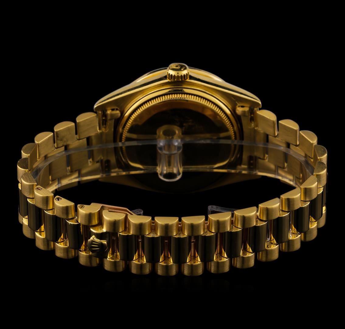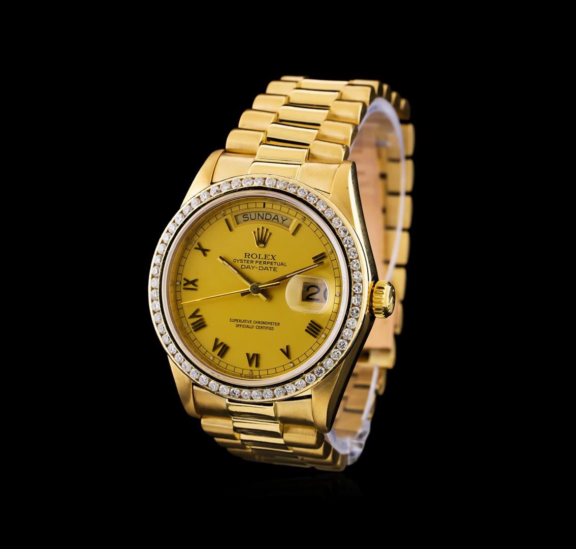 One Rolex President DayDate men's watch featuring: Case: 18KT yellow gold. Bezel: 18KT yellow gold diamond set. Crystal: Acrylic. Crown: Waterproof screw-down. Dial: Gold color; gold tone hour markers. Features: Day window located at the 12 o'clock position; date window located at the 3 o'clock position. Bracelet: 18KT yellow gold.