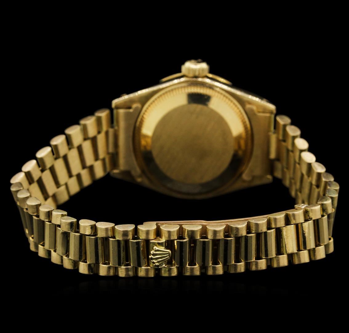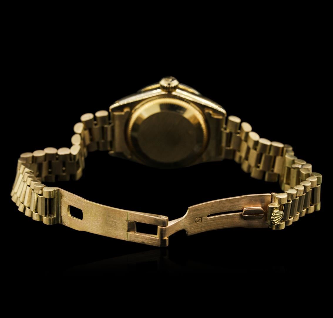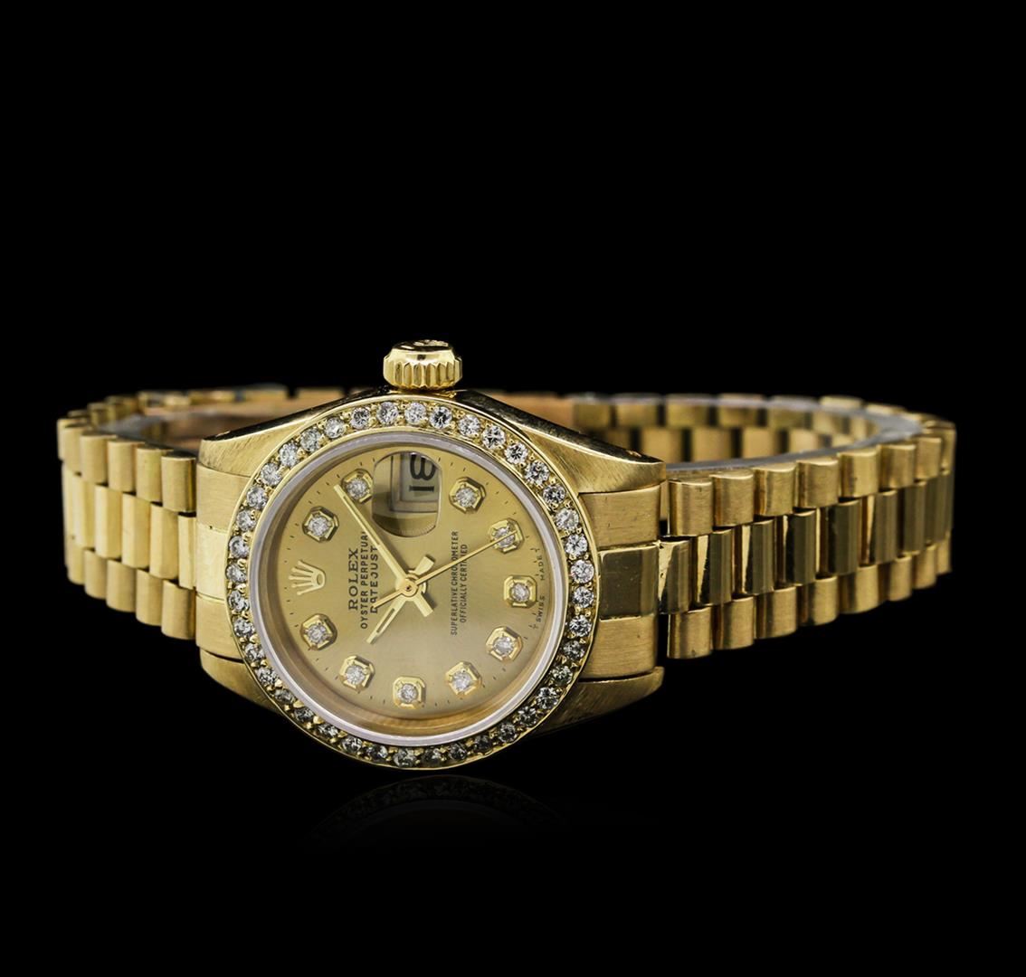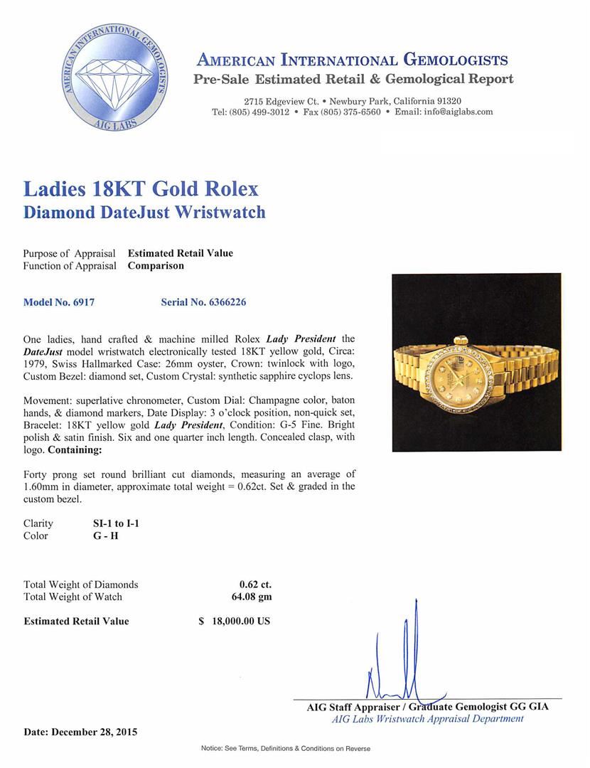 One ladies, hand crafted & machine milled Rolex Lady President the DateJust model wristwatch electronically tested 18KT yellow gold, Circa: 1979, Swiss Hallmarked Case: 26mm oyster, Crown: twinlock with logo, Custom Bezel: diamond set, Custom Crystal: synthetic sapphire cyclops lens. Movement: superlative chronometer, Custom Dial,: Champagne color, baton hands, & diamond markers, Date Display: 3 o'clock position, non-quick set, Bracelet: 18KT yellow gold Lady President, Condition: G-5 Fine. Bright polish & satin finish. Six and one quarter inch length. Concealed clasp, with logo. Containing: Forty prong set round brilliant cut diamonds, measuring an average of 1.60mm in diameter, approximate total weight = 0.62ct. Set & graded in the custom bezel. Clarity: SI-1 to I-1. Color: G - H. Total Weight of Diamonds: 0.62 ct. Total Weight of Watch: 64.08 gm. AIG Appraised at $18,000.00.