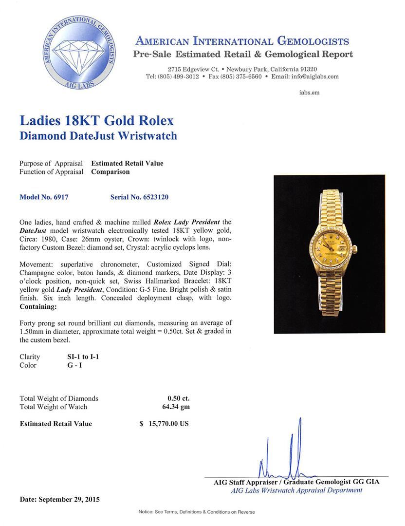 One ladies, hand crafted & machine milled Rolex Lady President the DateJust model wristwatch electronically tested 18KT yellow gold, Circa: 1980, Case: 26mm oyster, Crown: twinlock with logo, non-factory Custom Bezel: diamond set, Crystal: acrylic cyclops lens. Movement: superlative chronometer, Customized Signed Dial: Champagne color, baton hands, & diamond markers, Date Display: 3 o'clock position, non-quick set, Swiss Hallmarked Bracelet: 18KT yellow gold Lady President, Condition: G-5 Fine. Bright polish & satin finish. Six inch length. Concealed deployment clasp, with logo. Containing: Forty prong set round brilliant cut diamonds, measuring an average of 1.50mm in diameter, approximate total weight = 0.50ct. Set & graded in the custom bezel. Clarity SI-1 to I-1. Color: G - I. Total Weight of Diamonds 0.50ct. Total Weight of Watch 64.34gm. AIG Appraised at $15,770.00.