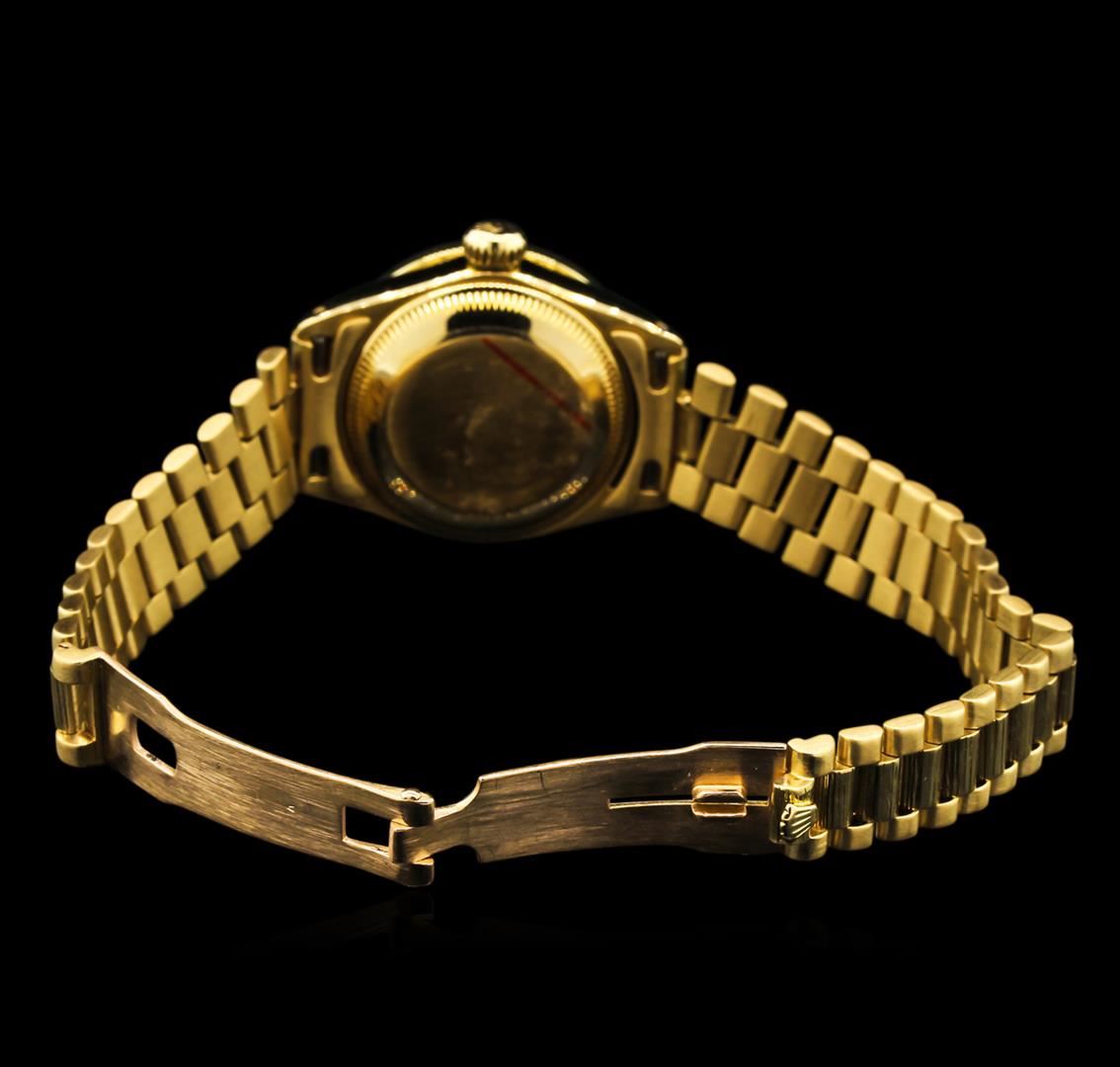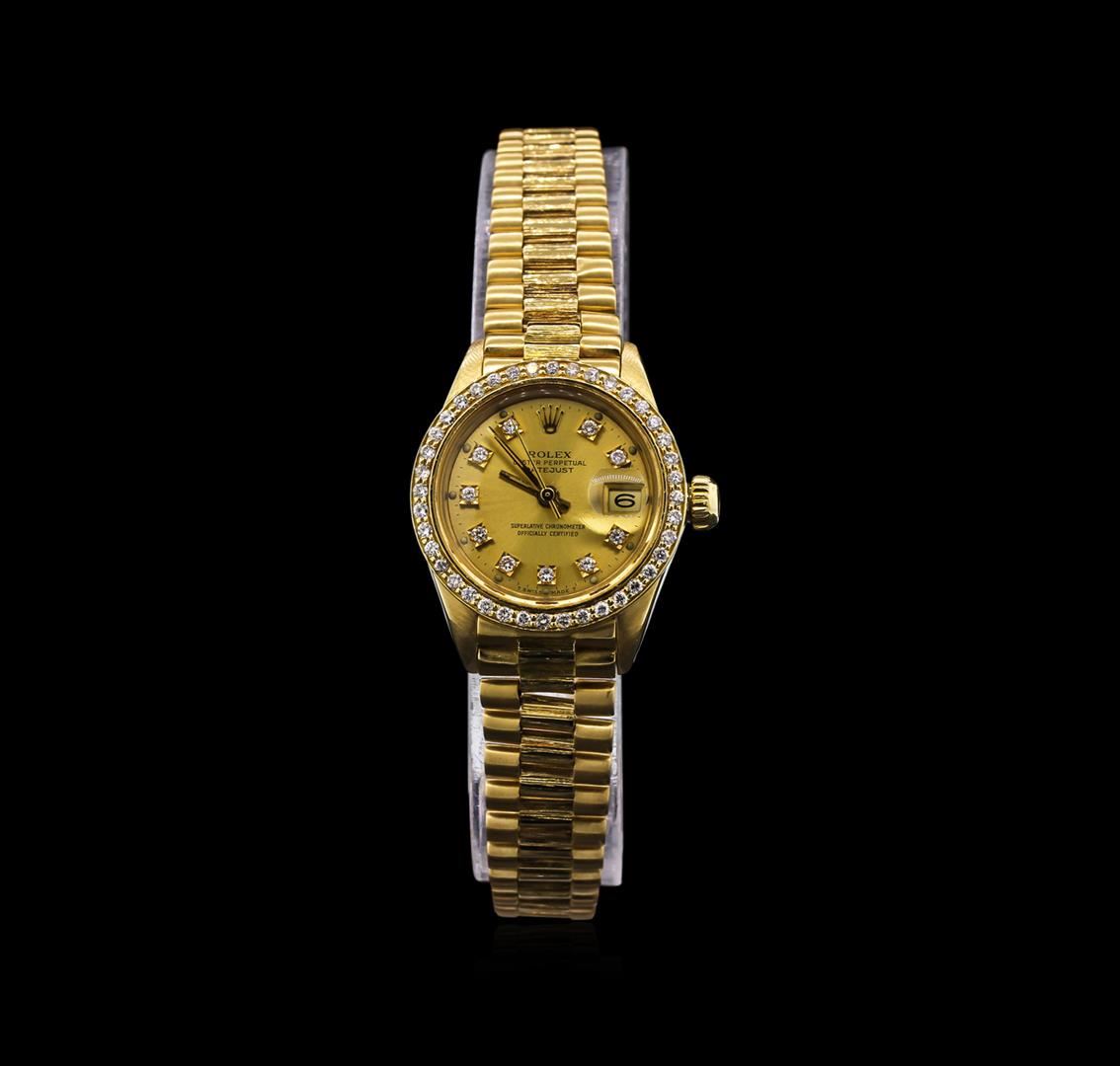 One ladies, hand crafted & machine milled Rolex Lady President the DateJust model wristwatch electronically tested 18KT yellow gold, Circa: 1980, Case: 26mm oyster, Crown: twinlock with logo, non-factory Custom Bezel: diamond set, Crystal: acrylic cyclops lens. Movement: superlative chronometer, Customized Signed Dial: Champagne color, baton hands, & diamond markers, Date Display: 3 o'clock position, non-quick set, Swiss Hallmarked Bracelet: 18KT yellow gold Lady President, Condition: G-5 Fine. Bright polish & satin finish. Six inch length. Concealed deployment clasp, with logo. Containing: Forty prong set round brilliant cut diamonds, measuring an average of 1.50mm in diameter, approximate total weight = 0.50ct. Set & graded in the custom bezel. Clarity SI-1 to I-1. Color: G - I. Total Weight of Diamonds 0.50ct. Total Weight of Watch 64.34gm. AIG Appraised at $15,770.00.