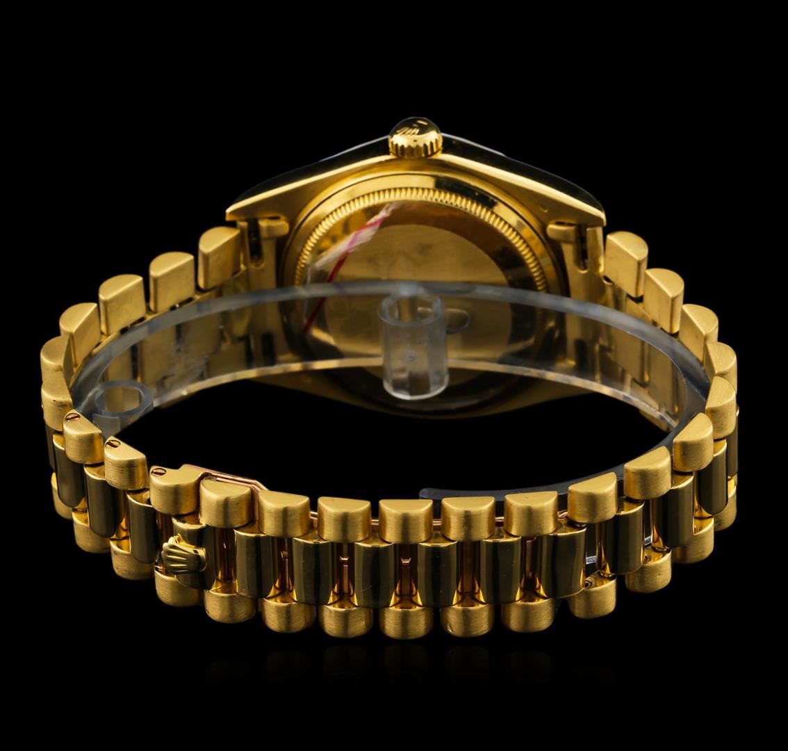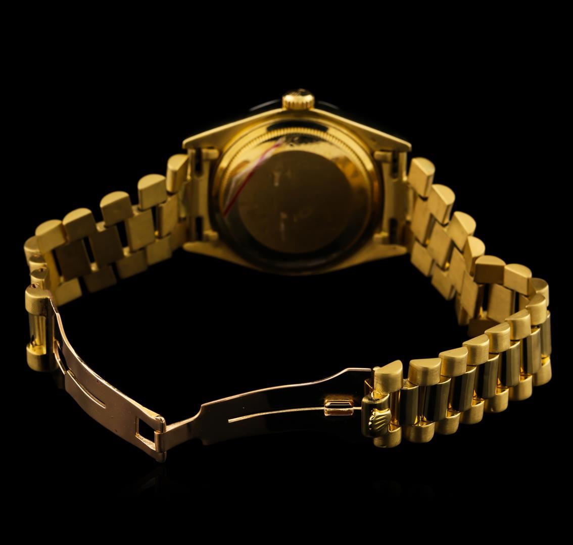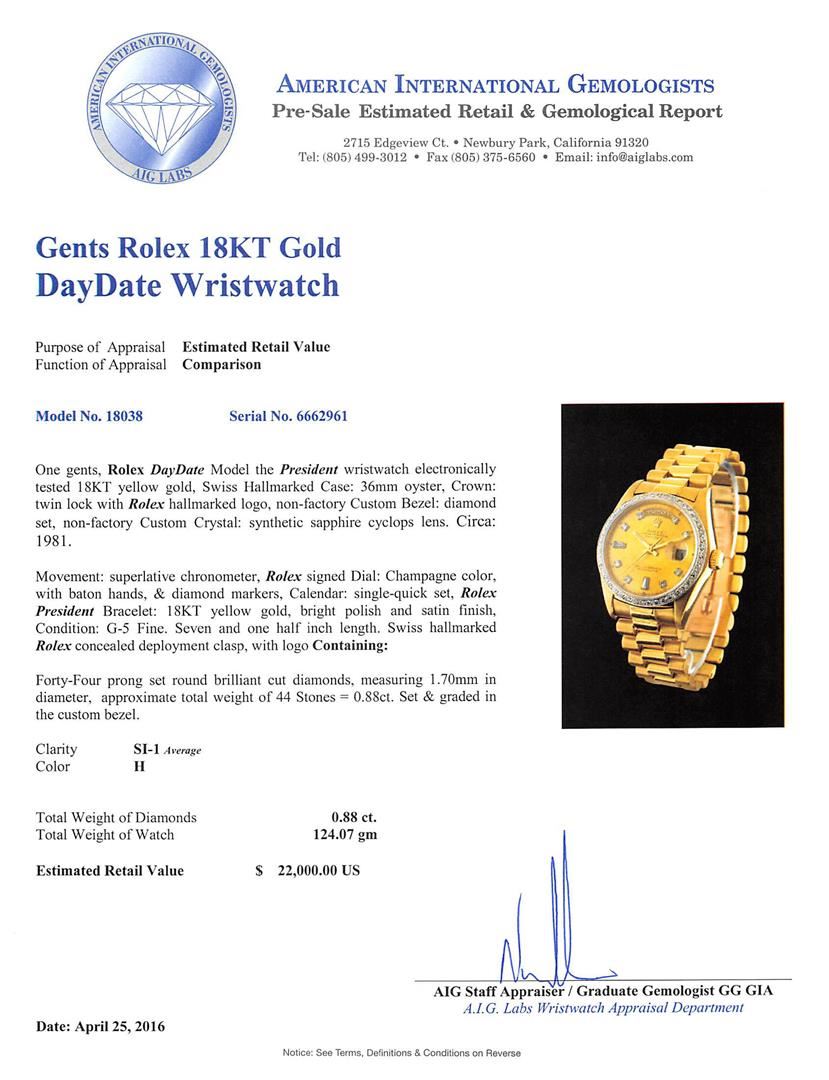 One gents, Rolex DayDate Model the President wristwatch electronically tested 18KT yellow gold, Swiss Hallmarked Case: 36mm oyster, Crown: twin lock with Rolex hallmarked logo, non-factory Custom Bezel: diamond set, non-factory Custom Crystal: synthetic sapphire cyclops lens. Circa: 1981.Movement: superlative chronometer, Rolex signed Dial: Champagne color, with baton hands, & diamond markers, Calendar: single-quick set, Rolex President Bracelet: 18KT yellow gold, bright polish and satin finish, Condition: G-5 Fine. Seven and one half inch length. Swiss hallmarked Rolex concealed deployment clasp, with logo Containing: Forty-Four prong set round brilliant cut diamonds, measuring 1.70mm in diameter, approximate total weight of 44 Stones = 0.88ct. Set & graded in the custom bezel. Clarity: SI-1 Average. Color: H. Total Weight of Diamonds 0.88ct. Total Weight of Watch 124.07gm. AIG Appraised at $22,000.00.