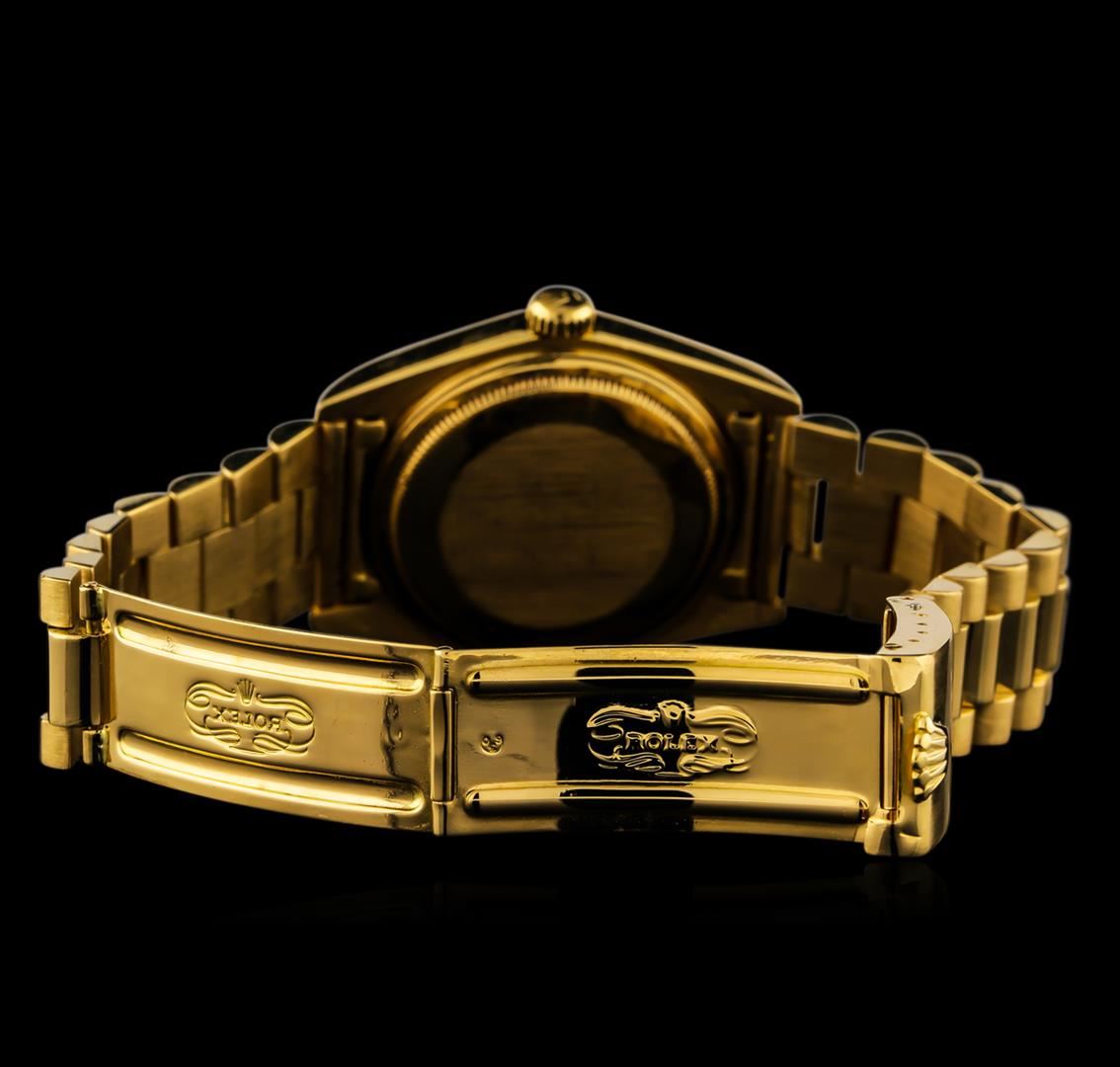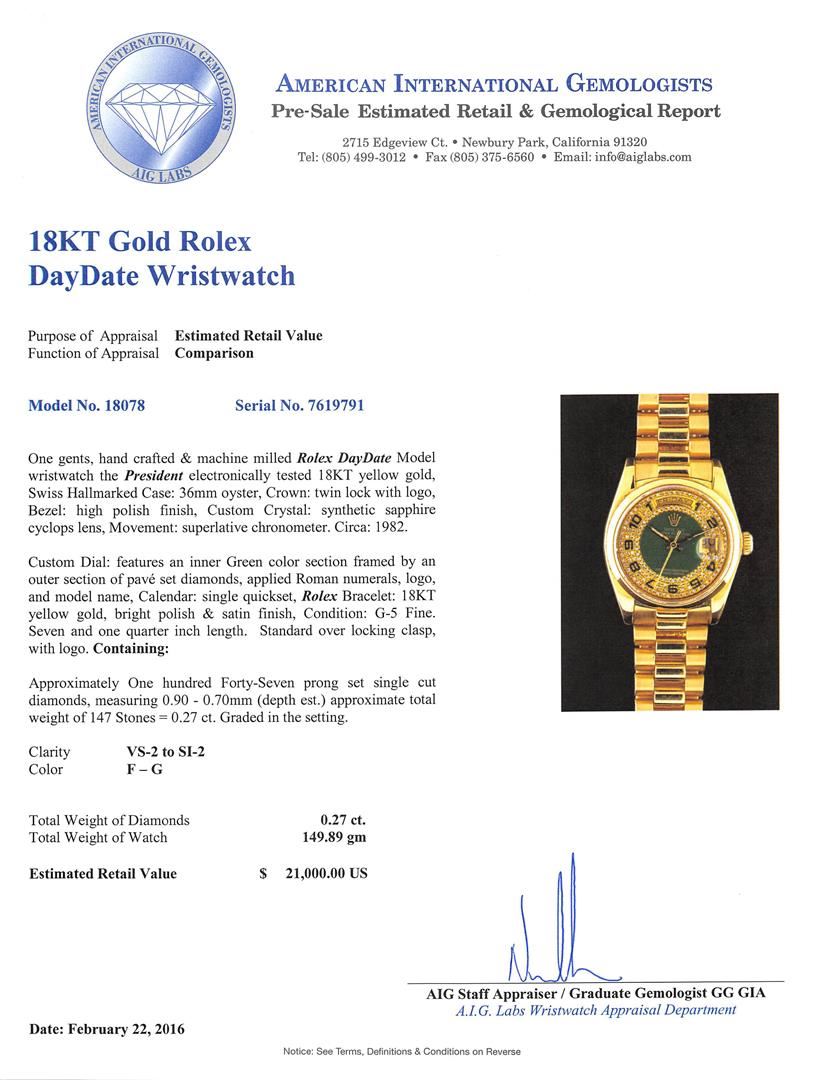 One gents, hand crafted & machine milled Rolex DayDate Model wristwatch the President electronically tested 18KT yellow gold, Swiss Hallmarked Case: 36mm oyster, Crown: twin lock with logo, Bezel: high polish finish, Custom Crystal: synthetic sapphire cyclops lens, Movement: superlative chronometer. Circa: 1982.Custom Dial: features an inner Green color section framed by an outer section of diamonds, applied Roman numerals, logo, and model name, Calendar: single quickset, Rolex Bracelet: 18KT yellow gold, bright polish & satin finish, Condition: G-5 Fine. Seven and one quarter inch length. Standard over locking clasp, with logo. Containing: Approximately One hundred Forty-Seven prong set single cut diamonds, measuring 0.90 - 0.70mm (depth est.) approximate total weight of 147 Stones = 0.27ct. Graded in the setting. Clarity: VS-2 to SI-2. Color: F - G. Total Weight of Diamonds 0.27ct. Total Weight of Watch 149.89gm. AIG Appraised at $21,000.00.
