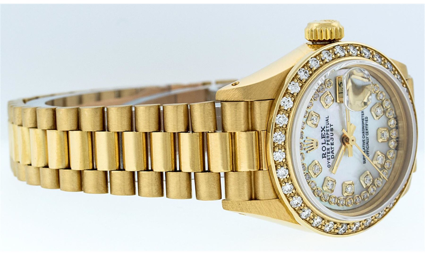 One Ladies Rolex 18K Yellow Gold President Polished, Serviced & Electronically Tested, 18K Yellow Gold Case: 26mm, 18K Yellow Gold Crown, Custom Bezel: 18K Yellow Gold Bead Set Diamond Bezel, Diamond Count: 32 Diamonds Total Weight .70 Carat, Clarity: SI-VS, Color: G to H. Custom Crystal: Synthetic Sapphire Cyclops Lens. Movement: Automatic Winding Movement Caliber 2030. Custom Dial: Mother Of Pearl With String Diamond Dial, Color: G to H, Diamond Count: 43 Diamonds In Dial, Clarity: SI-VS. Date Window: 3 O'Clock Position, Model: Datejust. Condition: G-6 Extra Fine The Watch Is In Very Good Condition Free Of All Scratches And Dents. . Bracelet: 18K Yellow Gold President Band, Bright & Satin Polish. 6.0 Inch Length, Standard President Clasp (Hidden Clasp), With Rolex Logo.