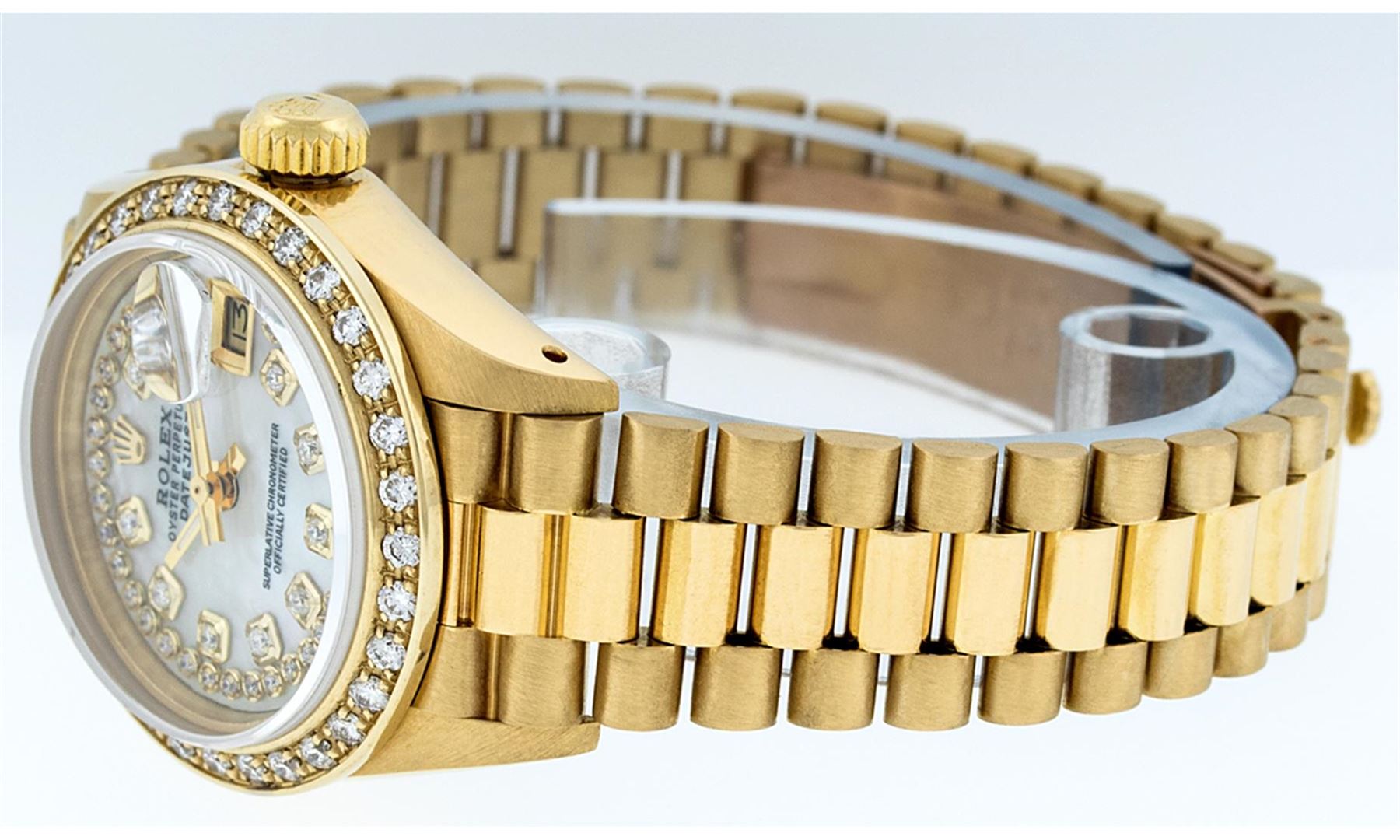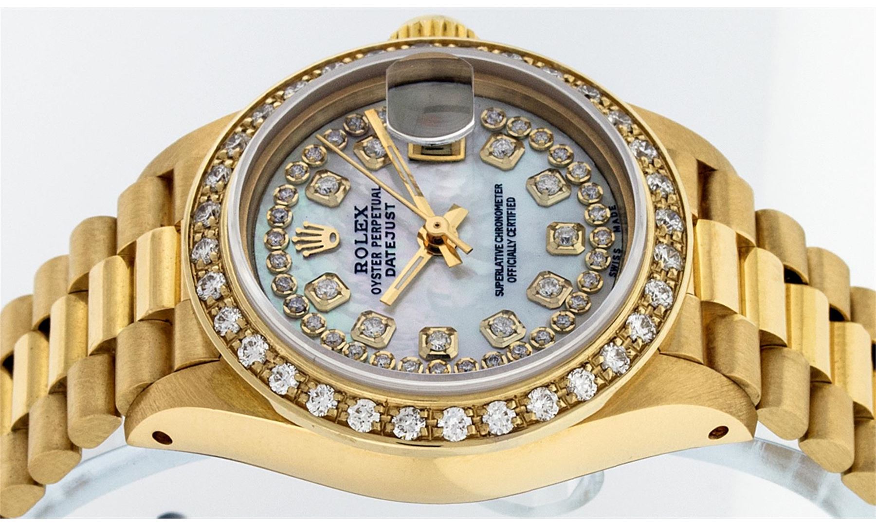 One Ladies Rolex 18K Yellow Gold President Polished, Serviced & Electronically Tested, 18K Yellow Gold Case: 26mm, 18K Yellow Gold Crown, Custom Bezel: 18K Yellow Gold Bead Set Diamond Bezel, Diamond Count: 32 Diamonds Total Weight .70 Carat, Clarity: SI-VS, Color: G to H. Custom Crystal: Synthetic Sapphire Cyclops Lens. Movement: Automatic Winding Movement Caliber 2030. Custom Dial: Mother Of Pearl With String Diamond Dial, Color: G to H, Diamond Count: 43 Diamonds In Dial, Clarity: SI-VS. Date Window: 3 O'Clock Position, Model: Datejust. Condition: G-6 Extra Fine The Watch Is In Very Good Condition Free Of All Scratches And Dents. . Bracelet: 18K Yellow Gold President Band, Bright & Satin Polish. 6.0 Inch Length, Standard President Clasp (Hidden Clasp), With Rolex Logo.