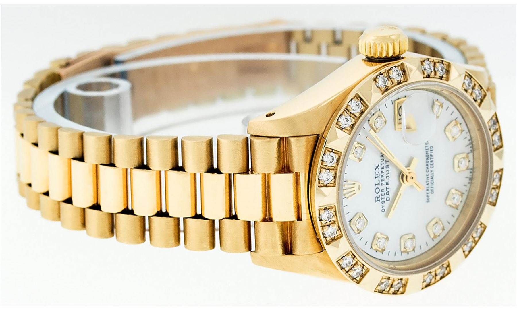One Ladies 18K Rolex President Polished, Serviced & Electronically Tested, 18K Yellow Gold Case: 26mm, 18K Yellow Gold Crown, Custom Bezel: 18K Yellow Gold Pyramid Diamond Bezel, Diamond Count: 24 Diamonds In Dial. Total Weight .50 Carat, Clarity: SI-VS, Color: G to H. Custom Crystal: Synthetic Sapphire Cyclops Lens. Movement: Automatic Winding Movement Caliber 2030. Custom Dial: Mother Of Pearl Diamond Dial With Line Track, Diamond Count: 10 Diamonds In Dial, Clarity: SI-VS, Color: G To H. Date Window: 3 O'Clock Position, Model: Datejust President, Condition: G-6 Extra Fine The Watch Is In Very Good Condition Free Of All Scratches And Dents. Bracelet: 18K Yellow Gold President With Hidden Clasp, Bright & Satin Polish. 6.0 Inch Length, Standard President Clasp (Hidden Clasp), With Rolex Logo. Comes with 6 month warranty.