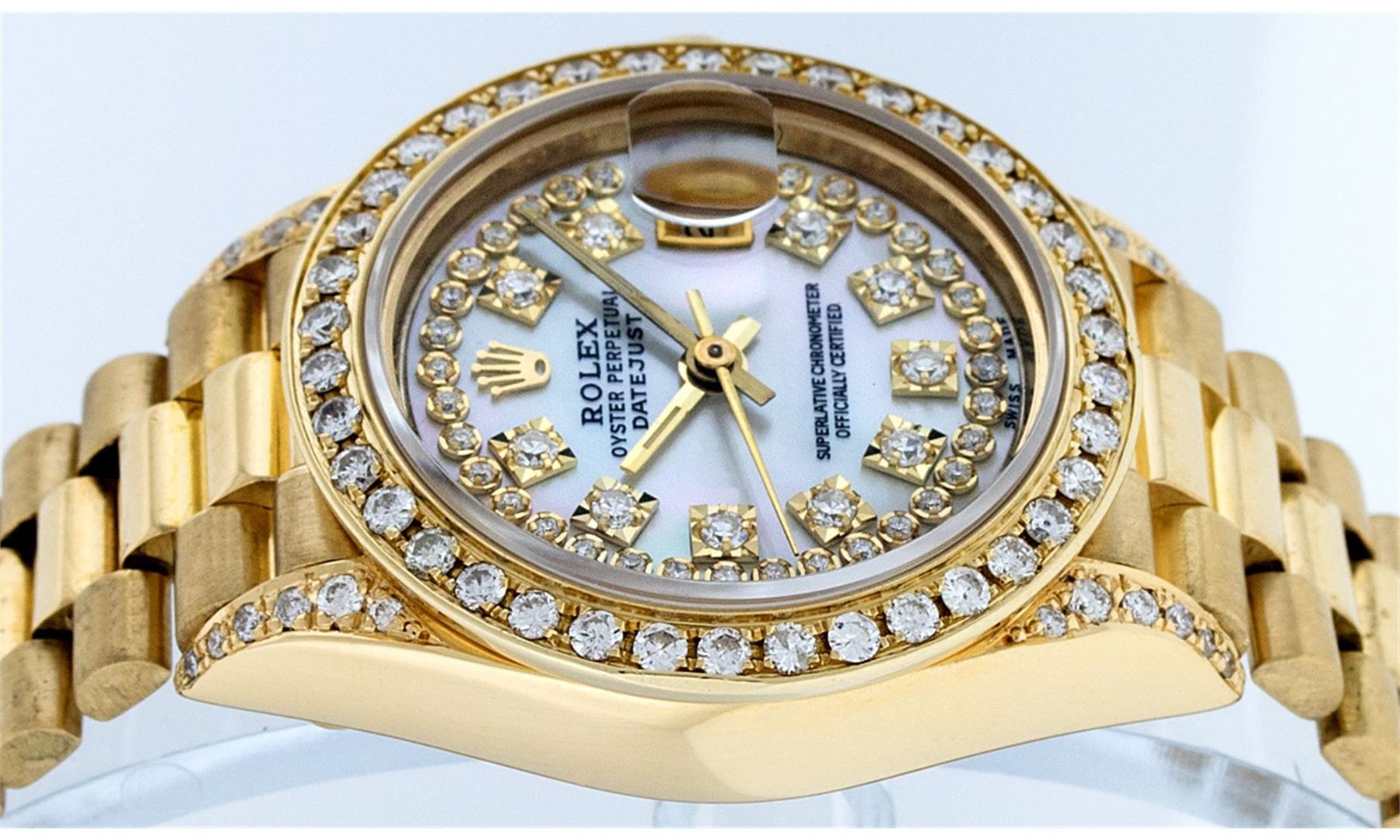 One Ladies 18K Quickset No Hole Rolex President Polished, Serviced & Electronically Tested, 18K Yellow Gold Case: 26mm, 18K Yellow Gold Crown, Diamond Lugs: 16 Diamonds In Lugs, Color: G to H, Clarity: SI-VS. Custom Bezel: 18K Yellow Gold Beadset Diamond Bezel, Diamond Count: 32 Diamonds. Total Weight .70 Carat, Clarity: SI-VS, Color: G to H. Custom Crystal: Synthetic Sapphire Cyclops Lens. Movement: Automatic Winding Movement Caliber 2135. Custom Dial: Mother Of Pearl String Diamond Dial, Stone Count: 43 Diamonds In Dial. Color: G to H, Clarity: VVS. Date Window: 3 O'Clock Position, Model: Datejust President, Quickset, Condition: G-6 Extra Fine, The Watch Is In Very Good Condition Free Of All Scratches And Dents. Bracelet: 18K Yellow Gold President With Hidden Clasp, Bright & Satin Polish. 6.0 Inch Length, Standard President Clasp (Hidden Clasp), With Rolex Logo.
