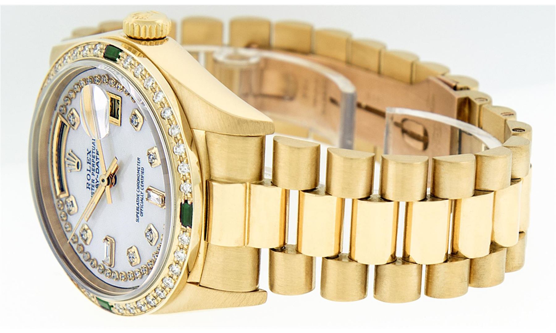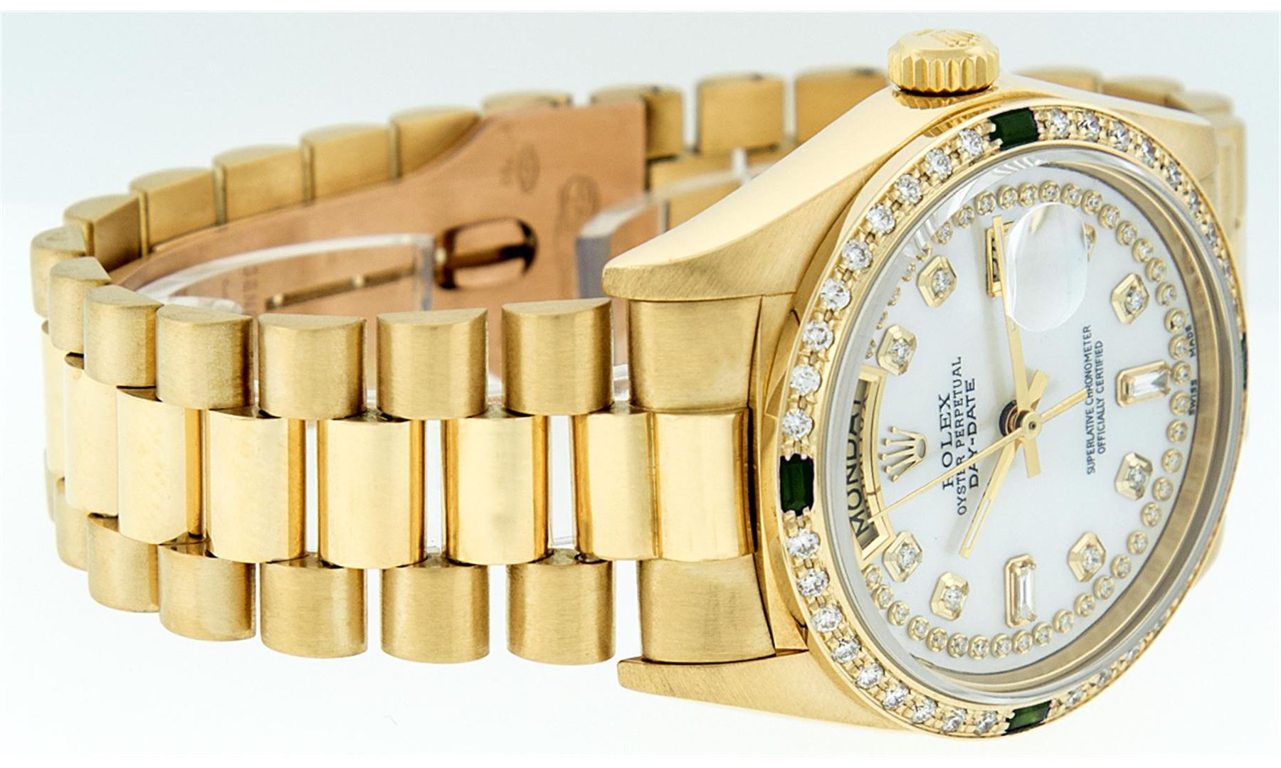 One Mens Rolex Day Date 18K Yellow Gold President Polished, Serviced & Electronically Tested, 18K Yellow Gold Case:36mm, 18K Yellow Gold Crown, Custom Bezel: 18K Yellow Gold Emerald Beadset Diamond Bezel, Diamond + Gem Count: 36 Diamonds + 4 Emeralds Total Weight 1.00 Carat, Clarity: SI-VS, Color: G to H. Custom Crystal: Synthetic Sapphire Cyclops Lens. Movement: Automatic Winding Movement Caliber 3055. Custom Dial: Mother Of Pearl String Diamond Dial With 2 Baguettes, (49 Diamond In Dial + 2 Baguette Diamonds In Dial) G To H In Color, Clarity: SI-VS. Date Window: 3 O'Clock Position Date Display, Day Window: 12 O'Clock Position Date Display. Quickset, Model: Day Date President. Condition: G-6 Extra Fine. Bracelet: 18K Yellow Gold President. Bright Polish. 7.0 Inch Length, Standard Hidden President Clasp President Band, With Rolex Logo.