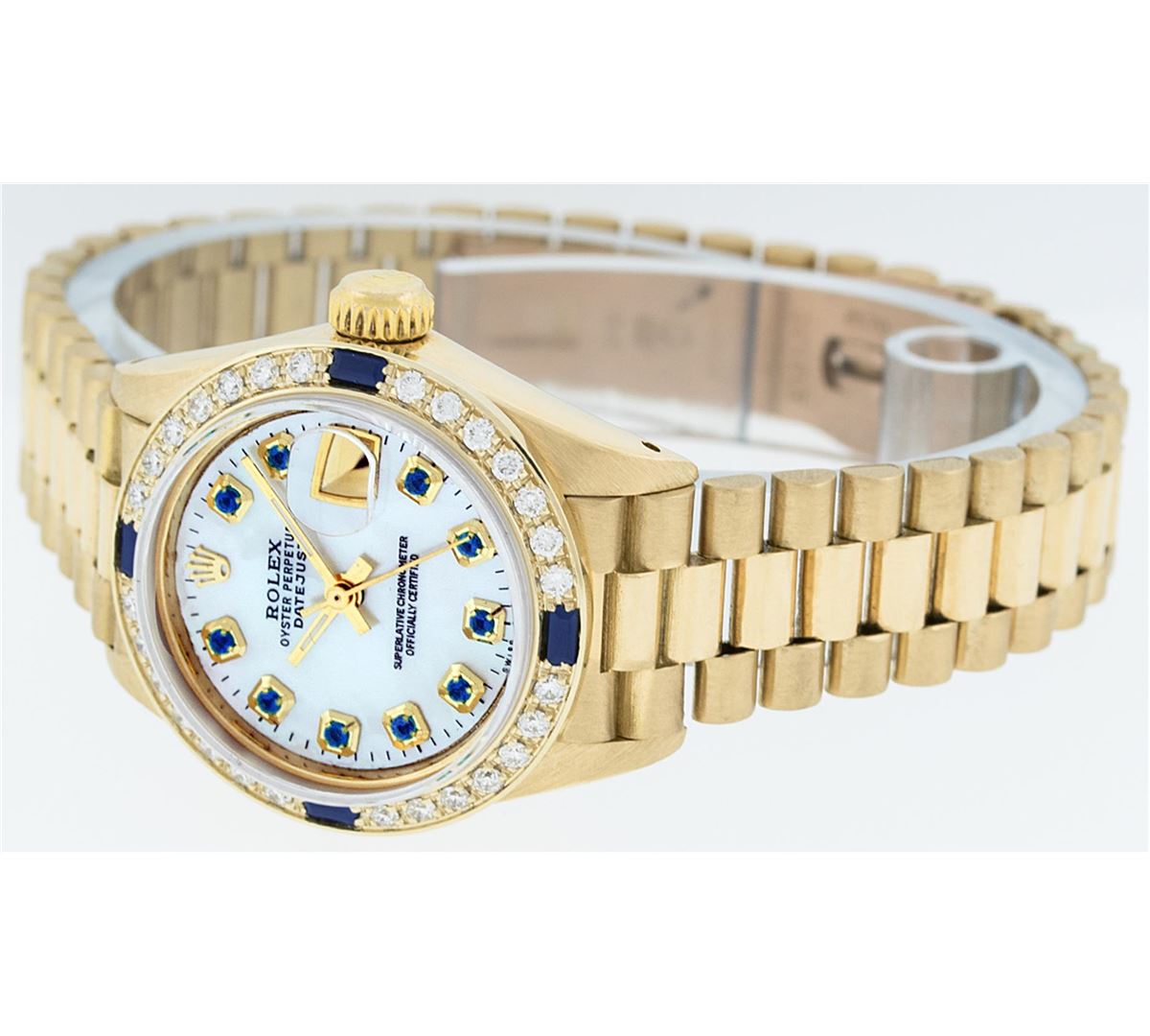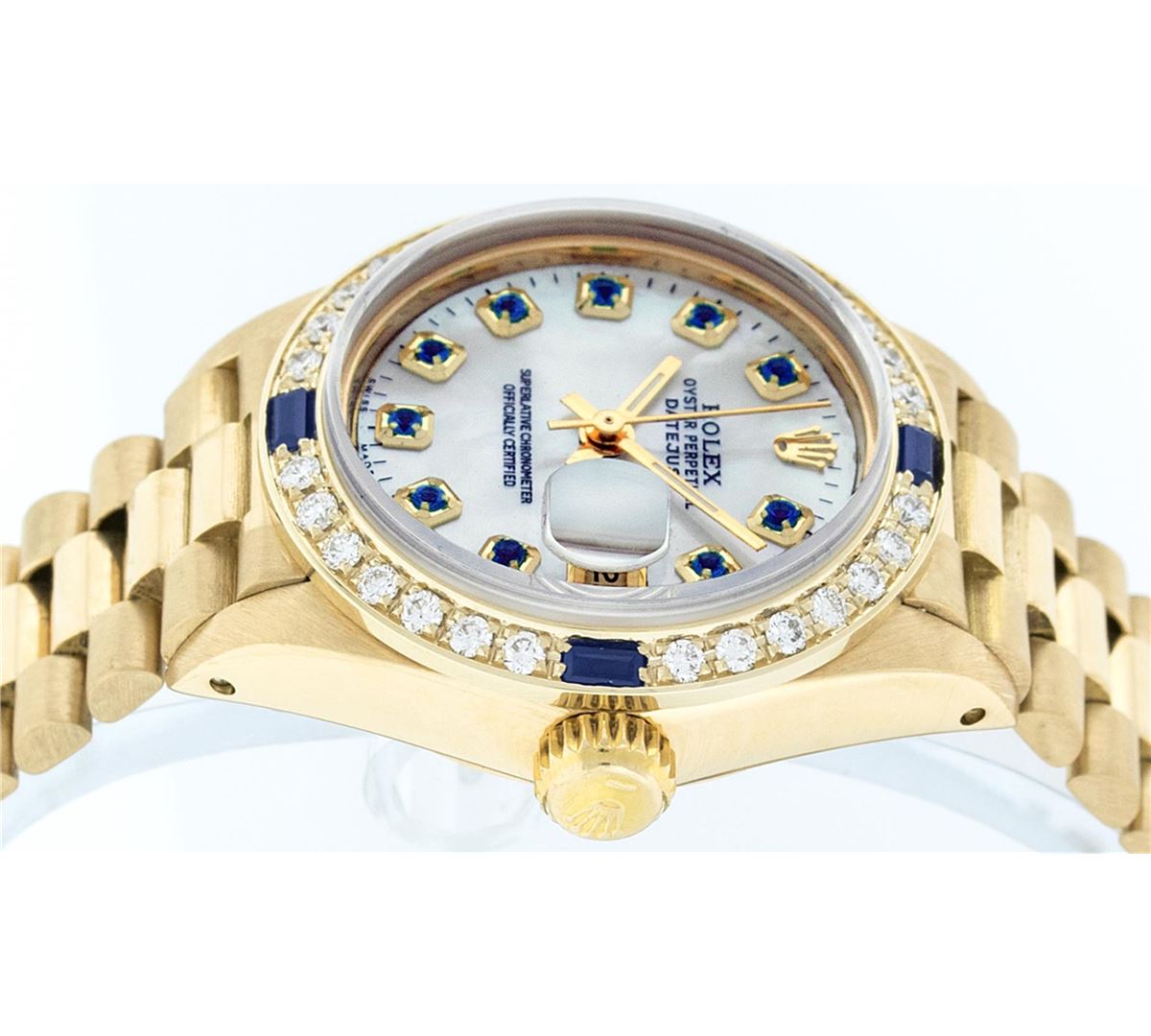One Ladies 18K Rolex President Polished, Serviced & Electronically Tested, 18K Yellow Gold Case: 26mm, 18K Yellow Gold Crown, Custom Bezel: 18K Yellow Gold Sapphire BeadSet Diamond Bezel, Diamond + Stone Count: 28 Diamonds + 4 Sapphires. Total Weight .70 Carat, Clarity: SI-VS, Color: G to H. Custom Crystal: Synthetic Sapphire Cyclops Lens. Movement: Automatic Winding Movement Caliber 2030. Custom Dial: Mother Of Pearl With Sapphires, Stone Count: 10 Sapphires In Dial. Date Window: 3 O'Clock Position, Model: Datejust, Condition: G-6 Extra Fine. Bracelet: 18K Yellow Gold President With Hidden Clasp, Bright & Satin Polish. 6.0 Inch Length, Standard President Clasp (Hidden Clasp), With Rolex Logo.