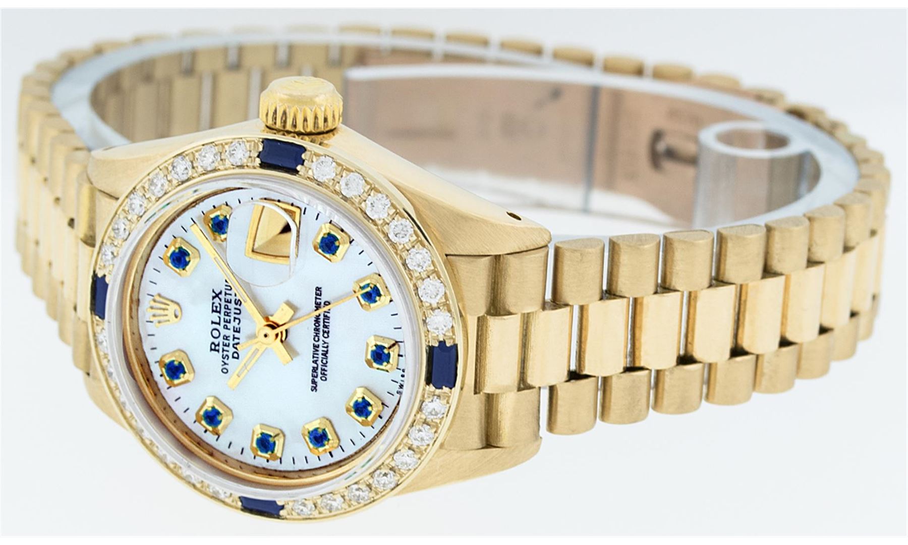 One Ladies 18K Rolex President Polished, Serviced & Electronically Tested, 18K Yellow Gold Case: 26mm, 18K Yellow Gold Crown, Custom Bezel: 18K Yellow Gold Sapphire BeadSet Diamond Bezel, Diamond + Stone Count: 28 Diamonds + 4 Sapphires. Total Weight .70 Carat, Clarity: SI-VS, Color: G to H. Custom Crystal: Synthetic Sapphire Cyclops Lens. Movement: Automatic Winding Movement Caliber 2030. Custom Dial: Mother Of Pearl With Sapphires, Stone Count: 10 Sapphires In Dial. Date Window: 3 O'Clock Position, Model: Datejust, Condition: G-6 Extra Fine. Bracelet: 18K Yellow Gold President With Hidden Clasp, Bright & Satin Polish. 6.0 Inch Length, Standard President Clasp (Hidden Clasp), With Rolex Logo.