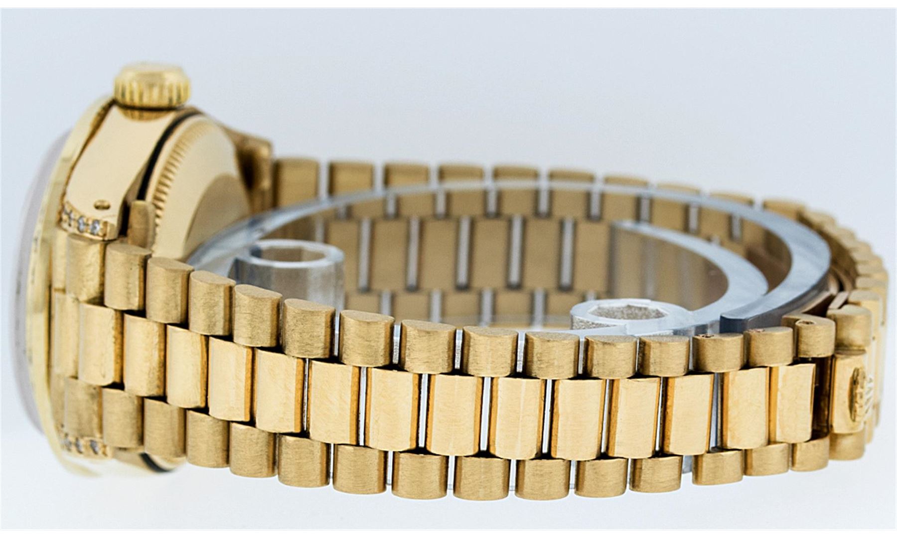 One Ladies Rolex President Polished, Serviced & Electronically Tested, Yellow Gold Case With Diamond Lugs: 26mm G to H In Color, SI1, Yellow Gold Crown, Custom Bezel: 18K Yellow Gold Sapphire Beadset Diamond Bezel, Diamond + Gem Count: 36 Diamonds + 4 Sapphires Total Weight .70 Carat, Clarity: SI-VS, Color: G to H. Custom Crystal: Synthetic Sapphire Cyclops Lens. Movement: Automatic Winding Movement Caliber 2030. Custom Dial: Blue Vignette With Diamond Hour Markers, Color: G To H. Clarity: SI-VS. Date Window: 3 O'Clock Position, Non Quickset, Model: 6917 Condition: G-6 Extra Fine. Bracelet: 18K Yellow Gold President Band, Bright & Satin Polish. 6.0 Inch Length, Standard President Clasp (Hidden Clasp), With Rolex Logo.