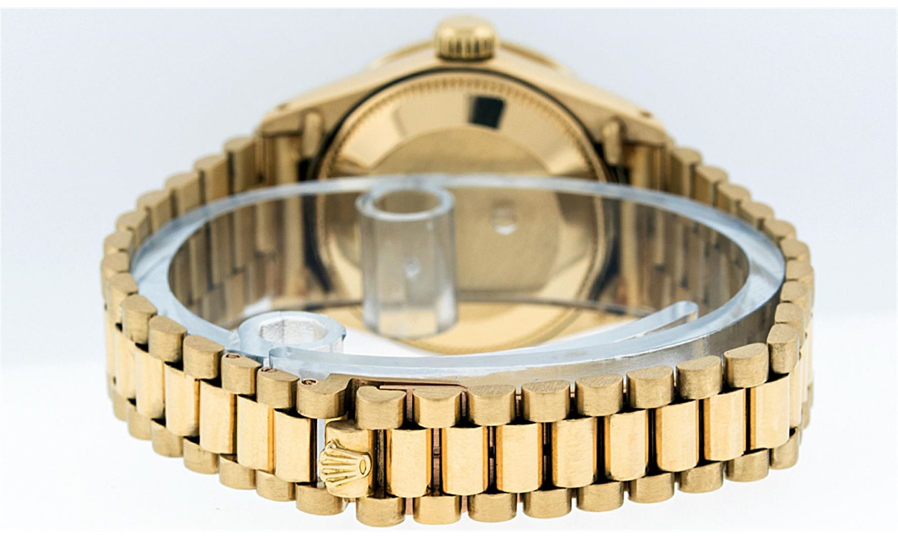 One Ladies Rolex President Polished, Serviced & Electronically Tested, Yellow Gold Case With Diamond Lugs: 26mm G to H In Color, SI1, Yellow Gold Crown, Custom Bezel: 18K Yellow Gold Sapphire Beadset Diamond Bezel, Diamond + Gem Count: 36 Diamonds + 4 Sapphires Total Weight .70 Carat, Clarity: SI-VS, Color: G to H. Custom Crystal: Synthetic Sapphire Cyclops Lens. Movement: Automatic Winding Movement Caliber 2030. Custom Dial: Blue Vignette With Diamond Hour Markers, Color: G To H. Clarity: SI-VS. Date Window: 3 O'Clock Position, Non Quickset, Model: 6917 Condition: G-6 Extra Fine. Bracelet: 18K Yellow Gold President Band, Bright & Satin Polish. 6.0 Inch Length, Standard President Clasp (Hidden Clasp), With Rolex Logo.