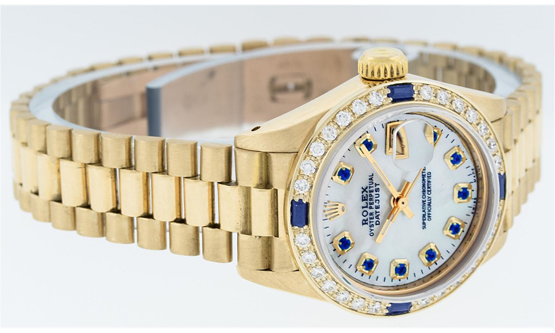 One Ladies 18K Rolex President Polished, Serviced & Electronically Tested, 18K Yellow Gold Case: 26mm, 18K Yellow Gold Crown, Custom Bezel: 18K Yellow Gold Sapphire BeadSet Diamond Bezel, Diamond + Stone Count: 28 Diamonds + 4 Sapphires. Total Weight .70 Carat, Clarity: SI-VS, Color: G to H. Custom Crystal: Synthetic Sapphire Cyclops Lens. Movement: Automatic Winding Movement Caliber 2030. Custom Dial: Mother Of Pearl With Sapphires, Stone Count: 10 Sapphires In Dial. Date Window: 3 O'Clock Position, Model: Datejust, Condition: G-6 Extra Fine. Bracelet: 18K Yellow Gold President With Hidden Clasp, Bright & Satin Polish. 6.0 Inch Length, Standard President Clasp (Hidden Clasp), With Rolex Logo.