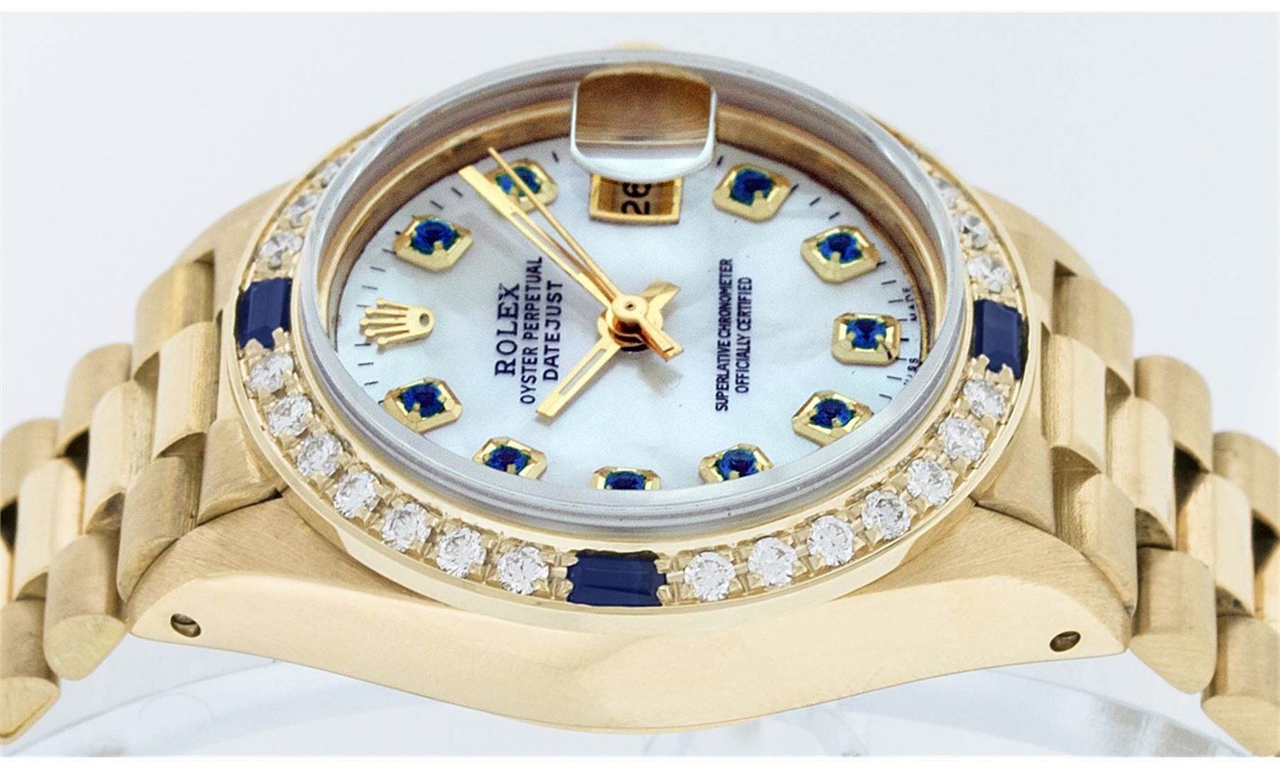 One Ladies 18K Rolex President Polished, Serviced & Electronically Tested, 18K Yellow Gold Case: 26mm, 18K Yellow Gold Crown, Custom Bezel: 18K Yellow Gold Sapphire BeadSet Diamond Bezel, Diamond + Stone Count: 28 Diamonds + 4 Sapphires. Total Weight .70 Carat, Clarity: SI-VS, Color: G to H. Custom Crystal: Synthetic Sapphire Cyclops Lens. Movement: Automatic Winding Movement Caliber 2030. Custom Dial: Mother Of Pearl With Sapphires, Stone Count: 10 Sapphires In Dial. Date Window: 3 O'Clock Position, Model: Datejust, Condition: G-6 Extra Fine. Bracelet: 18K Yellow Gold President With Hidden Clasp, Bright & Satin Polish. 6.0 Inch Length, Standard President Clasp (Hidden Clasp), With Rolex Logo.