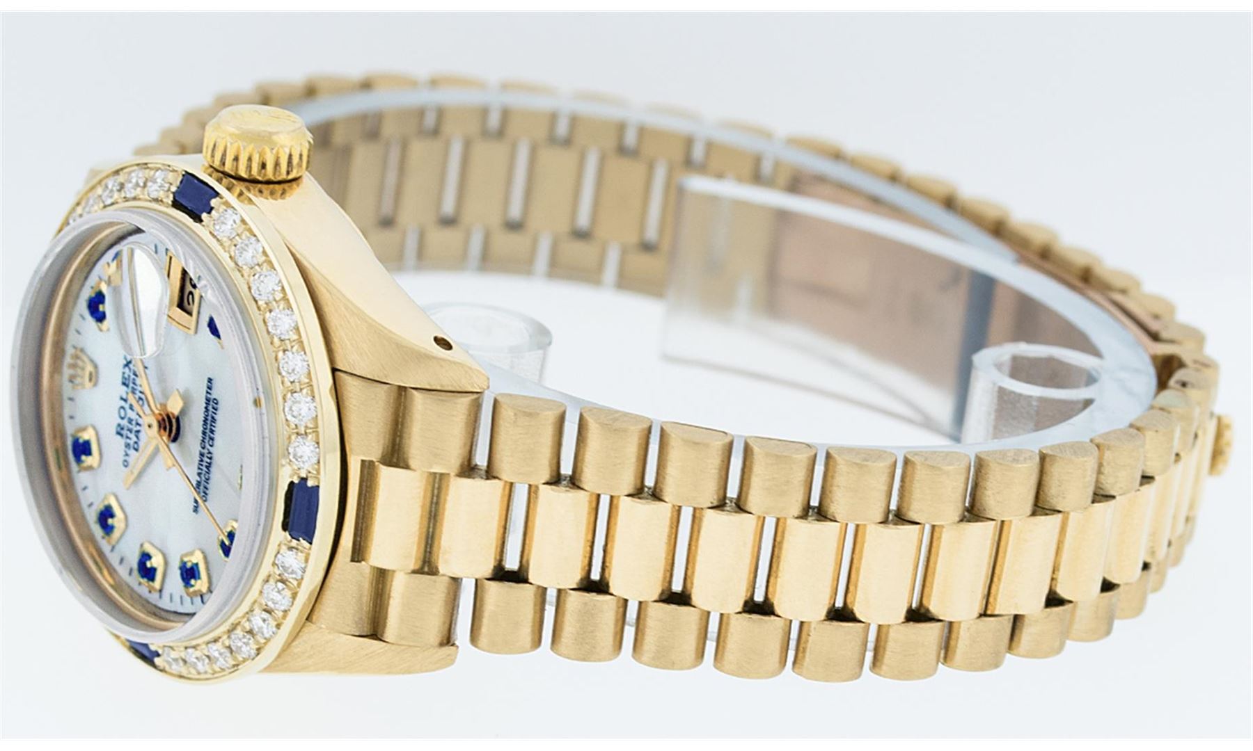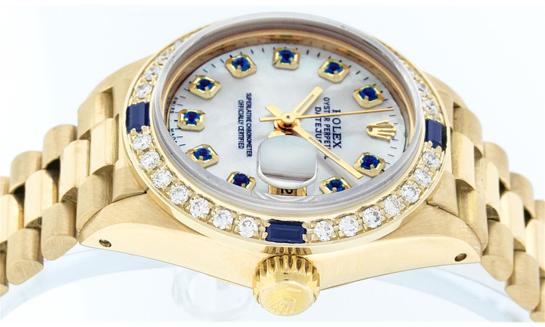 One Ladies 18K Rolex President Polished, Serviced & Electronically Tested, 18K Yellow Gold Case: 26mm, 18K Yellow Gold Crown, Custom Bezel: 18K Yellow Gold Sapphire BeadSet Diamond Bezel, Diamond + Stone Count: 28 Diamonds + 4 Sapphires. Total Weight .70 Carat, Clarity: SI-VS, Color: G to H. Custom Crystal: Synthetic Sapphire Cyclops Lens. Movement: Automatic Winding Movement Caliber 2030. Custom Dial: Mother Of Pearl With Sapphires, Stone Count: 10 Sapphires In Dial. Date Window: 3 O'Clock Position, Model: Datejust, Condition: G-6 Extra Fine. Bracelet: 18K Yellow Gold President With Hidden Clasp, Bright & Satin Polish. 6.0 Inch Length, Standard President Clasp (Hidden Clasp), With Rolex Logo.