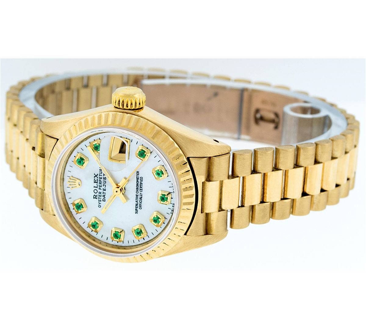 One Ladies 18K Rolex President Polished, Serviced & Electronically Tested, Yellow Gold Case: 26mm, 18K Yellow Gold Crown, Bezel: 18K Yellow Gold Fluted Bezel. Custom Crystal: Synthetic Acrylic Cyclops Lens. Movement: Automatic Winding Movement Caliber 2135. Custom Dial: Mother Of Pearl With Emeralds, Stone Count: 10 Emeralds In Dial. Date Window: 3 O'Clock Position, Quickset, Model: Quickset President Datejust, Condition: G-6 Extra Fine. Bracelet: 18K Yellow Gold President With Hidden Clasp, Bright & Satin Polish. 6.0 Inch Length, Standard President Clasp (Hidden Clasp), With Rolex Logo. Comes with 6 month warranty.
