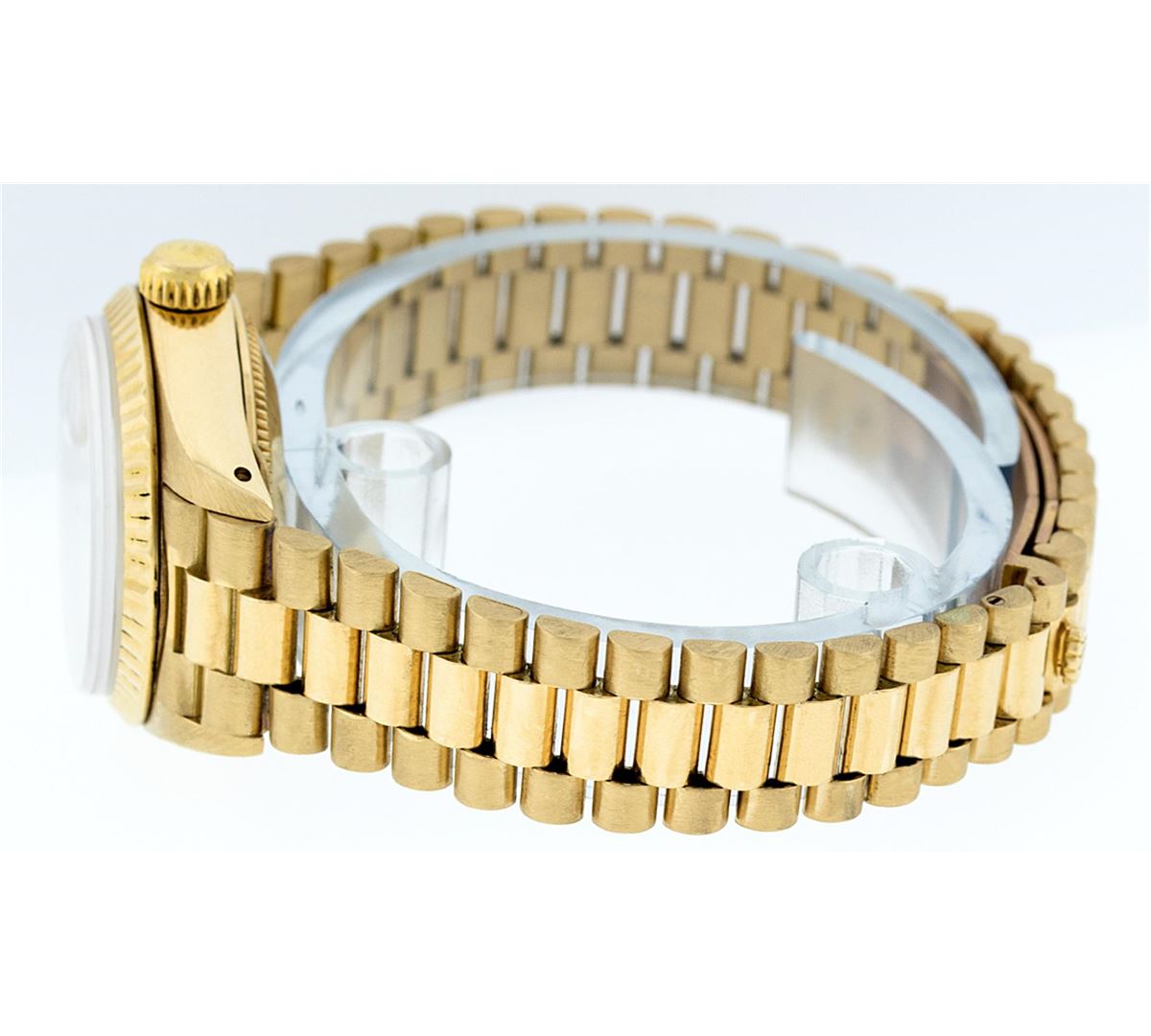 One Ladies 18K Rolex President Polished, Serviced & Electronically Tested, Yellow Gold Case: 26mm, 18K Yellow Gold Crown, Bezel: 18K Yellow Gold Fluted Bezel. Custom Crystal: Synthetic Acrylic Cyclops Lens. Movement: Automatic Winding Movement Caliber 2135. Custom Dial: Mother Of Pearl With Sapphires, Stone Count: 10 Sapphires In Dial. Date Window: 3 O'Clock Position, Quickset, Model: Quickset President Datejust, Condition: G-6 Extra Fine. Bracelet: 18K Yellow Gold President With Hidden Clasp, Bright & Satin Polish. 6.0 Inch Length, Standard President Clasp (Hidden Clasp), With Rolex Logo. Comes with 6 month warranty.