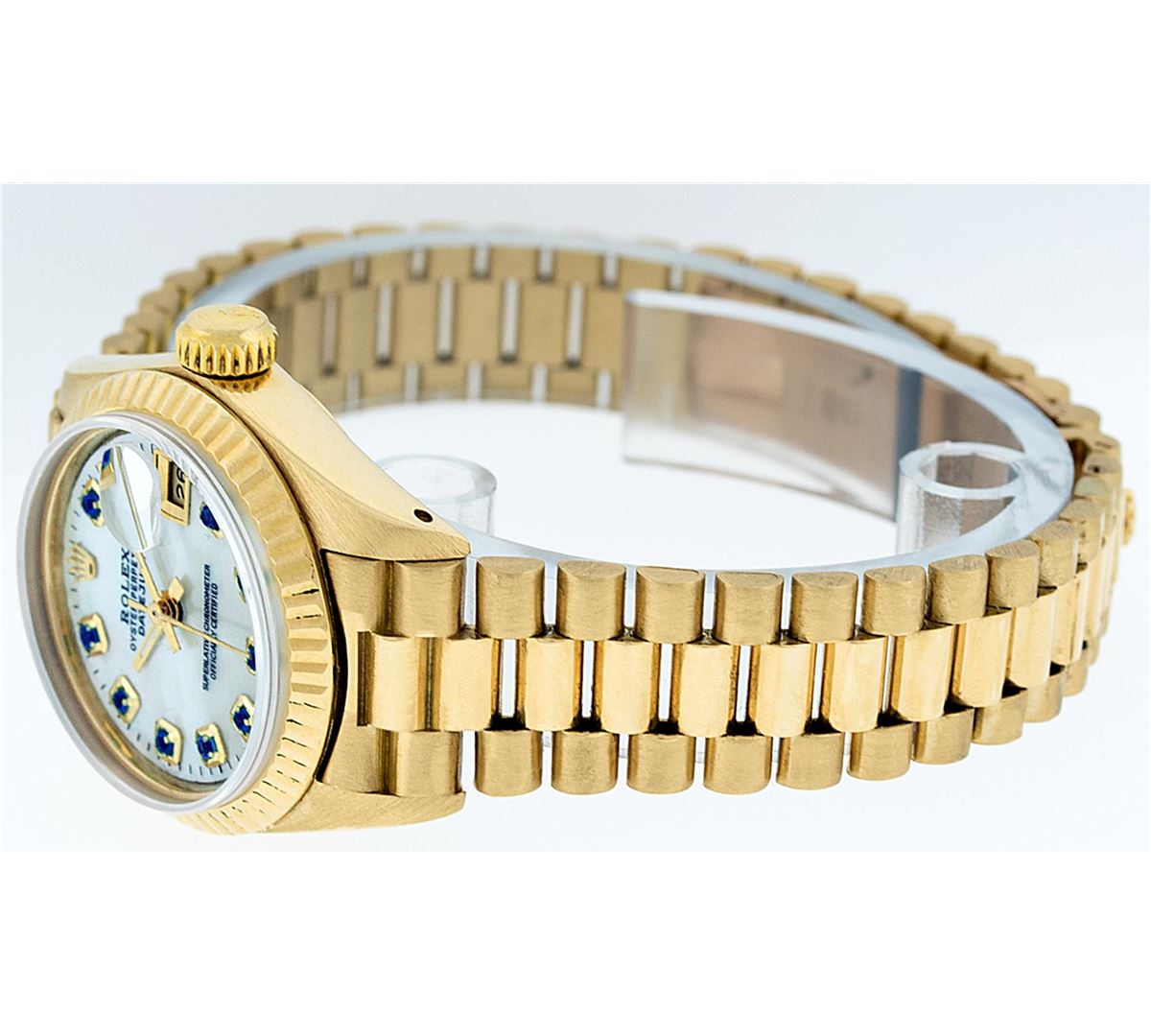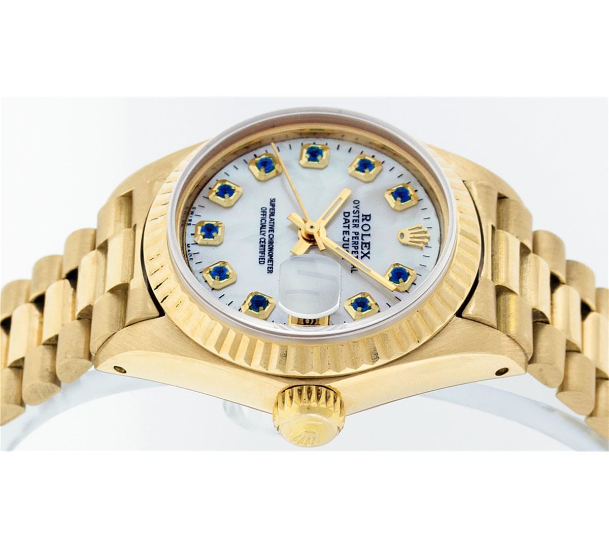 One Ladies 18K Rolex President Polished, Serviced & Electronically Tested, Yellow Gold Case: 26mm, 18K Yellow Gold Crown, Bezel: 18K Yellow Gold Fluted Bezel. Custom Crystal: Synthetic Acrylic Cyclops Lens. Movement: Automatic Winding Movement Caliber 2135. Custom Dial: Mother Of Pearl With Sapphires, Stone Count: 10 Sapphires In Dial. Date Window: 3 O'Clock Position, Quickset, Model: Quickset President Datejust, Condition: G-6 Extra Fine. Bracelet: 18K Yellow Gold President With Hidden Clasp, Bright & Satin Polish. 6.0 Inch Length, Standard President Clasp (Hidden Clasp), With Rolex Logo. Comes with 6 month warranty.