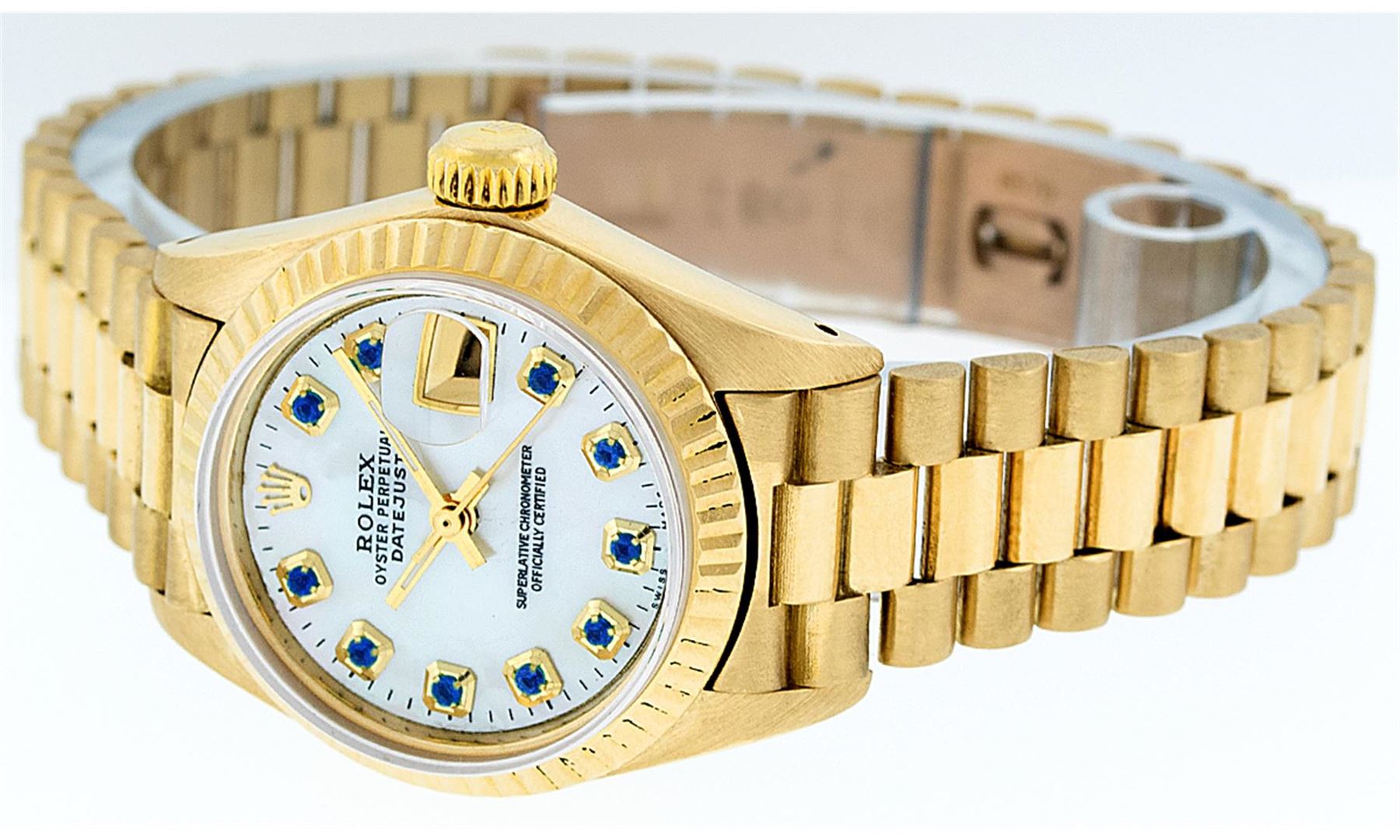 One Ladies 18K Rolex President Polished, Serviced & Electronically Tested, Yellow Gold Case: 26mm, 18K Yellow Gold Crown, Bezel: 18K Yellow Gold Fluted Bezel. Custom Crystal: Synthetic Acrylic Cyclops Lens. Movement: Automatic Winding Movement Caliber 2135. Custom Dial: Mother Of Pearl With Sapphires, Stone Count: 10 Sapphires In Dial. Date Window: 3 O'Clock Position, Quickset, Model: Quickset President Datejust, Condition: G-6 Extra Fine. Bracelet: 18K Yellow Gold President With Hidden Clasp, Bright & Satin Polish. 6.0 Inch Length, Standard President Clasp (Hidden Clasp), With Rolex Logo. Comes with 6 month warranty.
