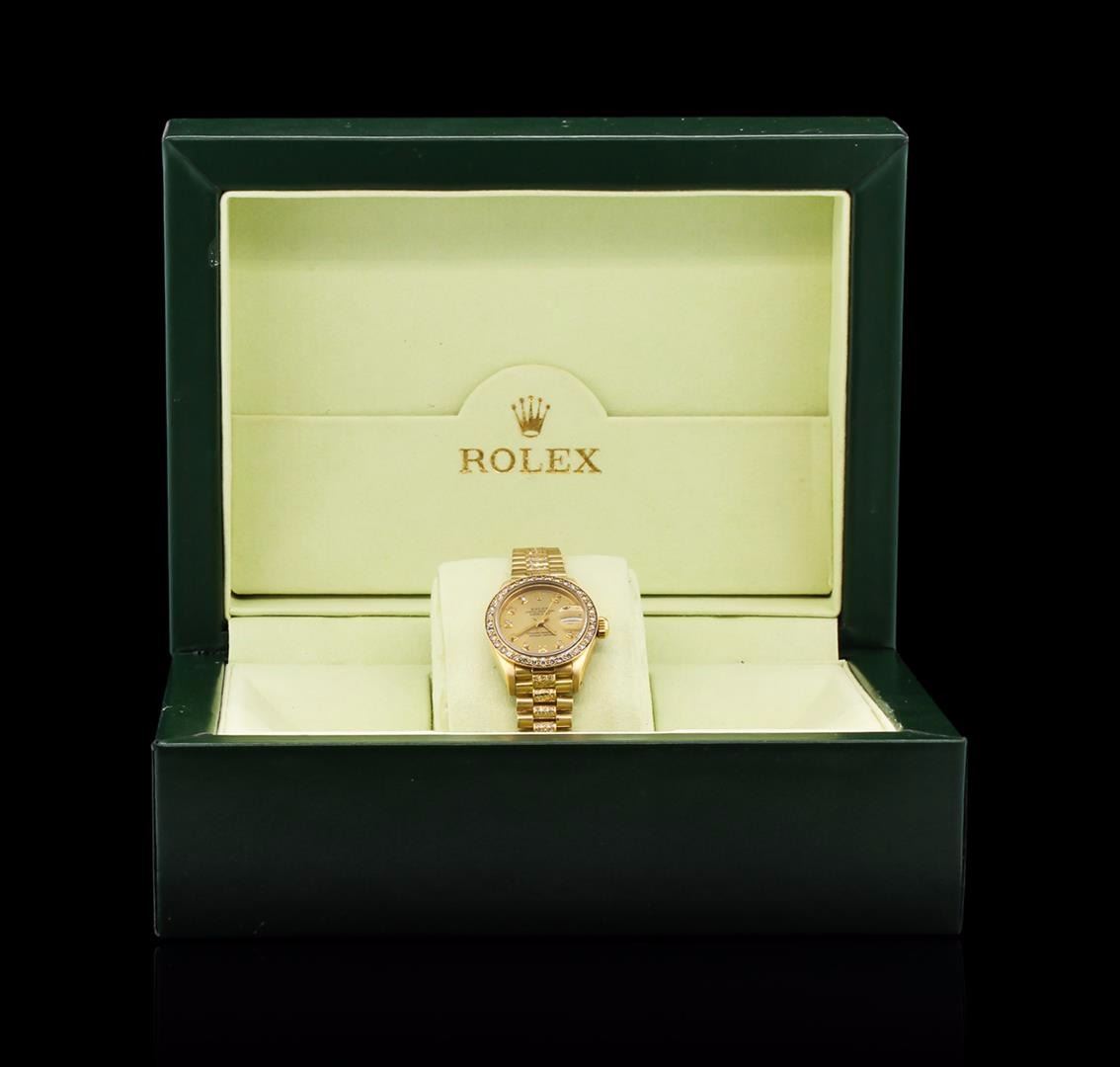 One ladies, hand crafted & machine milled Rolex customized DateJust Model wristwatch electronically tested 18KT yellow gold, Swiss Hallmarked Case: 26mm oyster, Crown: twinlock with logo, Custom Bezel: diamond set, Custom Crystal: synthetic sapphire cyclops lens. Movement: superlative chronometer automatic, Custom Dial: Champagne color, with baton hands, and diamond markers, Date Window: 3 o'clock position, non-quick set, Swiss Hallmarked Customized Bracelet: 18KT yellow gold Super President style, Condition: G-5 Fine. Circa: 1977, Bright polish & satin finish. Six inch length. Concealed deployment clasp, with logo. Containing: Approximately Two Hundred Fifty Five round brilliant & single cut diamonds, approximate total weight = 1.82ct. Set & graded in the bracelet, the bezel, and the dial. Clarity VS-2 to SI-1 Average. Color: G - H. Total Weight of Diamonds 1.82ct. Total Weight of Watch 64.98gm. AIG Appraised at $18,550.00.