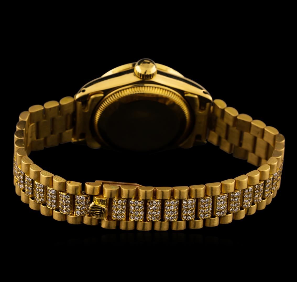 One ladies, Rolex customized DateJust Model wristwatch electronically tested 18KT yellow gold, Case: 26mm oyster, Rolex Signature Crown: twinlock with logo, Custom Bezel: diamond set, Custom Crystal: synthetic sapphire cyclops lens. Movement: superlative chronometer, custom Rolex Signed Dial: mother of pearl, with baton hands, and diamond markers, Date Window: 3 o'clock position, non-quick set, Customized Rolex Bracelet: 18KT yellow gold Super President style, Condition: G-5 Fine. Circa: 1980, Six and one quarter inch length. Swiss Hallmarked Rolex concealed deployment clasp, with logo. Containing: Thirty-Two prong set round brilliant cut diamonds, measuring 1.60 x 0.96mm, approx. total weight of 32 Stones = 0.50ct. Set & graded in the bezel. Clarity: VS-2 to SI-2 Color F - G. Ten prong set round brilliant cut diamonds, measuring 1.20 - 1.10 x 0.69mm (depth est.) approximate total weight of 10 Stones = 0.06ct. Set & graded on the dial. Clarity: SI-1 to I-1 Color F - H. Approximately Four Hundred Twenty-Four prong set round brilliant cut diamonds, measuring 1.10 - 0.90 x 0.60mm (depth est.) approximate total weight of 424 Stones = 1.62ct. Set & graded in the bracelet. Clarity: VS-1 to SI-1 Color F - H. Total Weight of Diamonds 2.18ct.Total Weight of Watch 72.26gm. AIG Appraised at $19,550.00.
