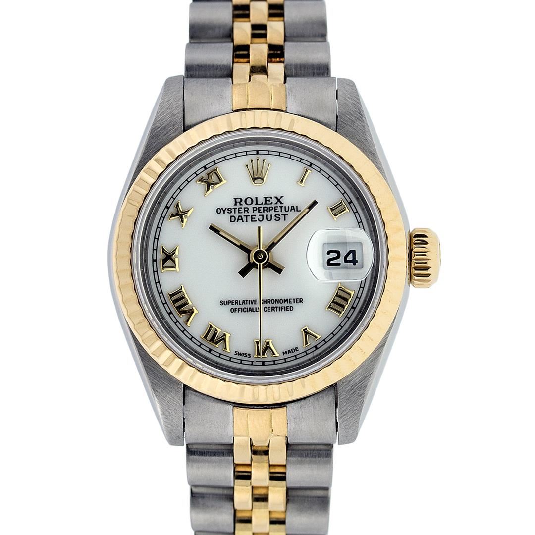 One Ladies Two Tone Quickset Rolex Datejust Polished, Serviced & Electronically Tested, 18K Yellow Gold & Stainless Steel Case:26mm, 18K Yellow Gold Crown, Bezel: 18K Yellow Gold Fluted Bezel. Custom Crystal: Sapphire Cyclops Lens. Movement: Automatic Winding Movement Caliber 2235. Dial: White Roman Dial. Date Window: 3 O'Clock Position Date Display, Model: No Hole Quickset Datejust. Condition: G-6 Extra Fine. Bracelet: Two Tone 18K Yellow Gold & Stainless Steel Jubilee Band. Bright Polish. 6.0 Inch Length, Adjustable. Standard Clasp, With Rolex Logo. Comes with 6 month warranty.