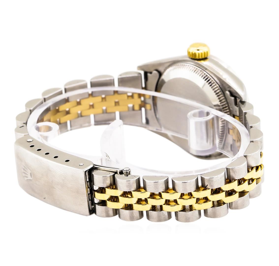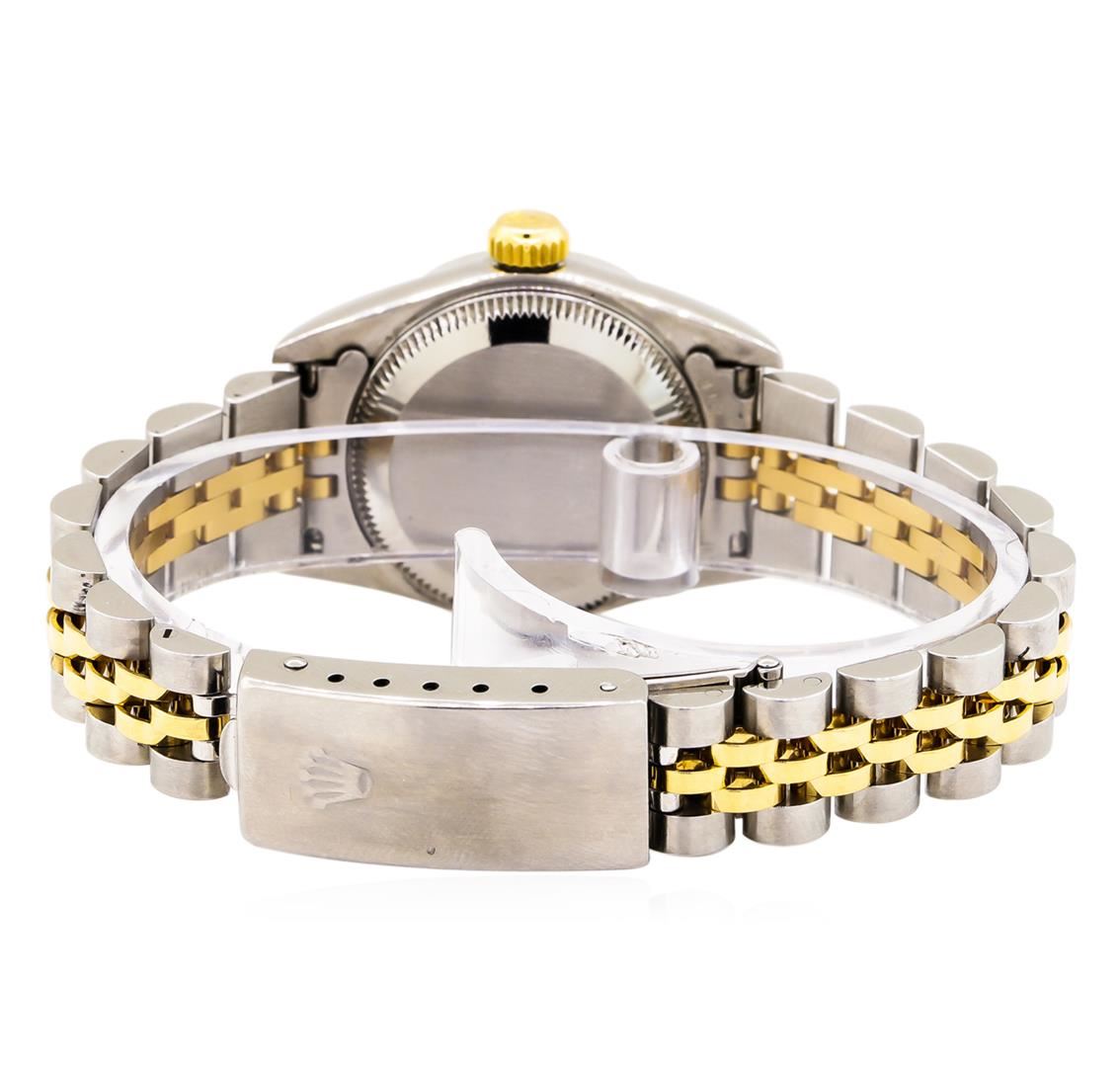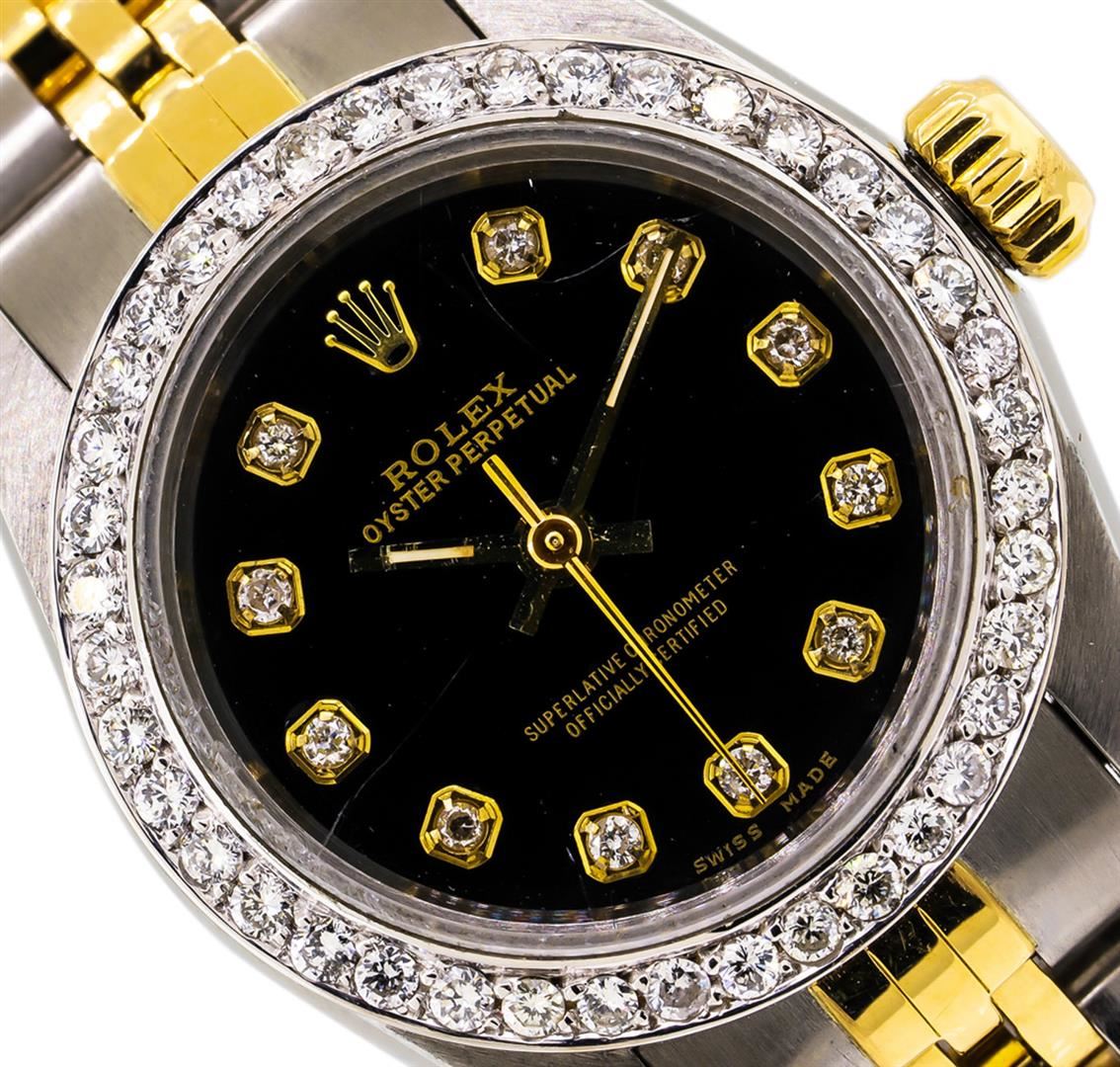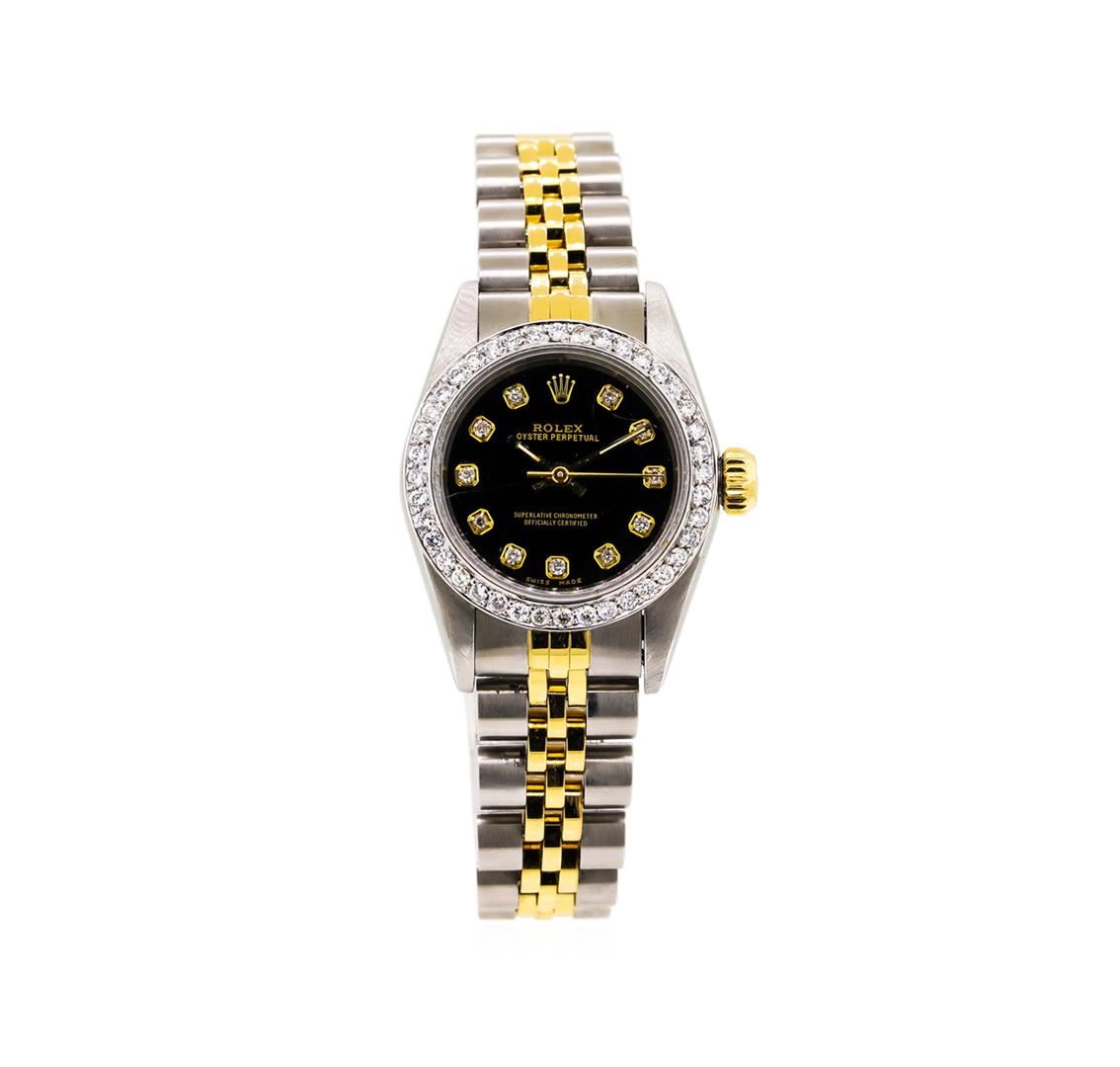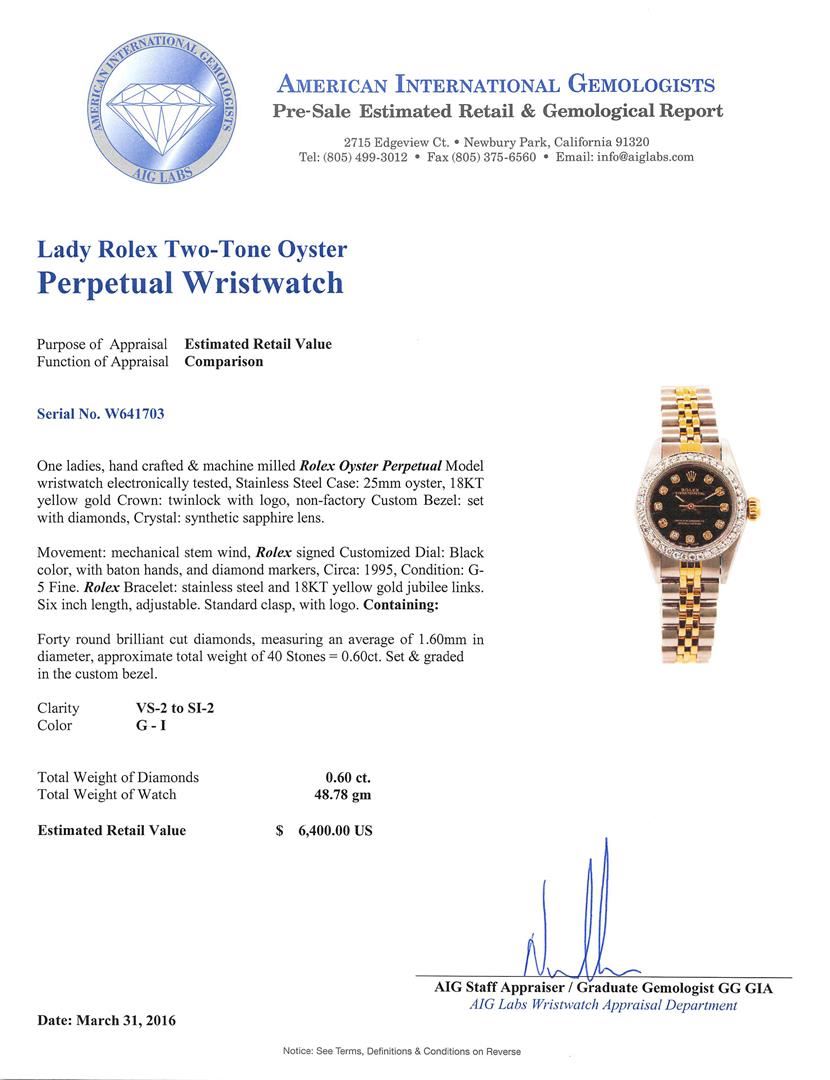 One ladies, hand crafted & machine milled Rolex Oyster Perpetual Model wristwatch electronically tested, Stainless Steel Case: 25mm oyster, 18KT yellow gold Crown: twinlock with logo, non-factory Custom Bezel: set with diamonds, Crystal: synthetic sapphire lens. Movement: mechanical stem wind, Rolex signed Customized Dial: Black color, with baton hands, and diamond markers, Circa: 1995, Condition: G-5 Fine. Rolex Bracelet: stainless steel and 18KT yellow gold jubilee links. Six inch length, adjustable. Standard clasp, with logo. Containing: Forty round brilliant cut diamonds, measuring an average of 1.60mm in diameter, approximate total weight of 40 Stones = 0.60ct. Set & graded in the custom bezel. Clarity: VS-2 to SI-2. Color: G - I. Total Weight of Diamonds 0.60ct. Total Weight of Watch 48.78gm. AIG Appraised at $6,400.00.