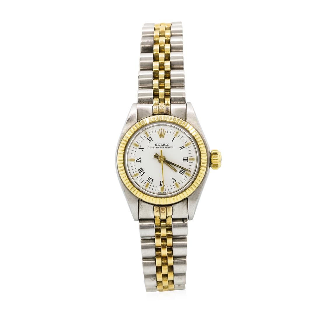 One 18KT two tone yellow gold and stainless steel Rolex ladie's Oyster Perpetual featuring case: Rolex Ladies Oyster case in stainless steel with a Solid Yellow Gold bezel and original screw-in crown signed with logo. Measures 26 mm wide and 32 mm long. B