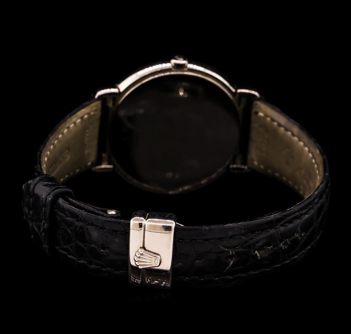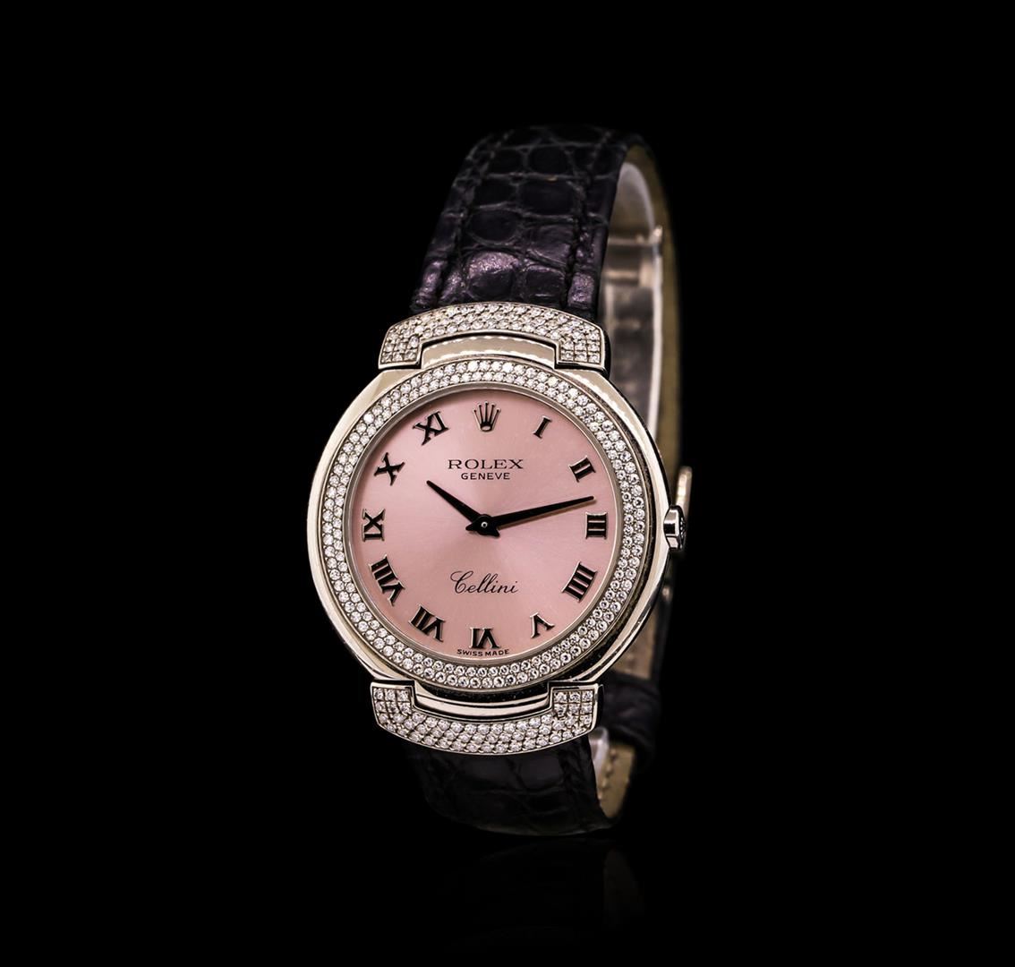One, Rolex Cellini Cellissima wristwatch, electronically tested 18KT white gold, Case: 33mm diameter, Case Back: engraved with the manufacturers ID numbers, Bezel: diamond set, Logo'd Crown: Crystal: synthetic sapphire, Circa 1999.Movement: quartz, Dial: Pink, with pointed hands and Roman numerals, signed Rolex Cellini, Bracelet: Rolex, saddle stitched crocodile strap, 18KT white gold Buckle: Rolex concealed deployment clasp, Condition: G-5 fine. Seven and one half inch length, adjustable. Containing: Two Hundred Seventy Two single cut diamonds, approximate total weight equals 1.00ct. Set & graded in the bezel, and the case lugs. Clarity VS-1 Average. Color: F - G. Total Weight of Diamonds 1.00ct. Total Weight of Watch 58.40 grams. AIG Appraised at $19,750.00.