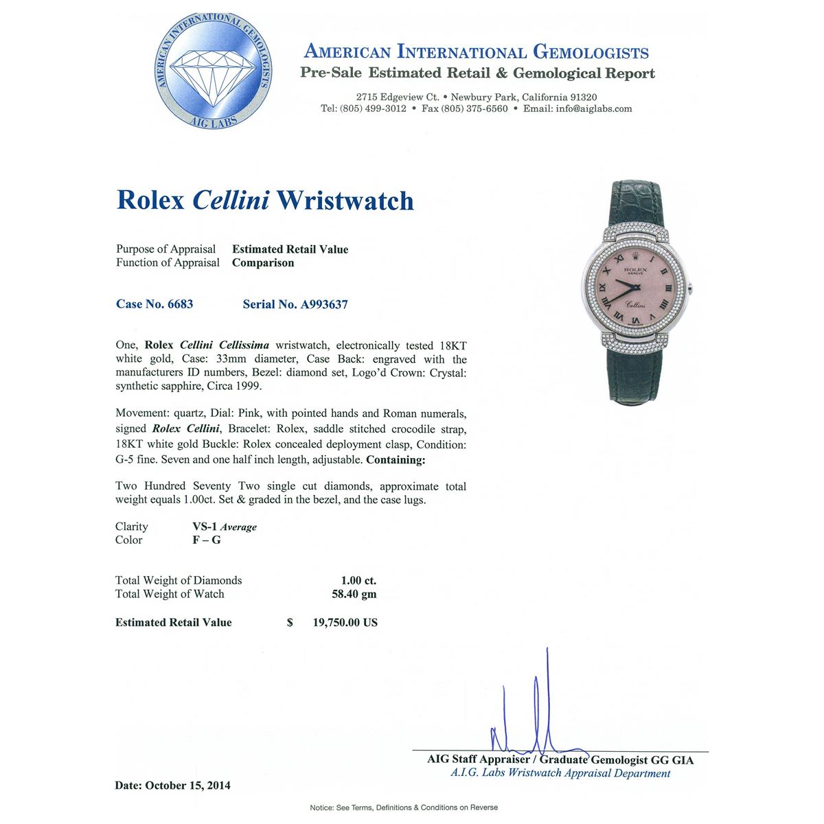 One, Rolex Cellini Cellissima wristwatch, electronically tested 18KT white gold, Case: 33mm diameter, Case Back: engraved with the manufacturers ID numbers, Bezel: diamond set, Logo'd Crown: Crystal: synthetic sapphire, Circa 1999.Movement: quartz, Dial: Pink, with pointed hands and Roman numerals, signed Rolex Cellini, Bracelet: Rolex, saddle stitched crocodile strap, 18KT white gold Buckle: Rolex concealed deployment clasp, Condition: G-5 fine. Seven and one half inch length, adjustable. Containing: Two Hundred Seventy Two single cut diamonds, approximate total weight equals 1.00ct. Set & graded in the bezel, and the case lugs. Clarity VS-1 Average. Color: F - G. Total Weight of Diamonds 1.00ct. Total Weight of Watch 58.40 grams. AIG Appraised at $19,750.00.