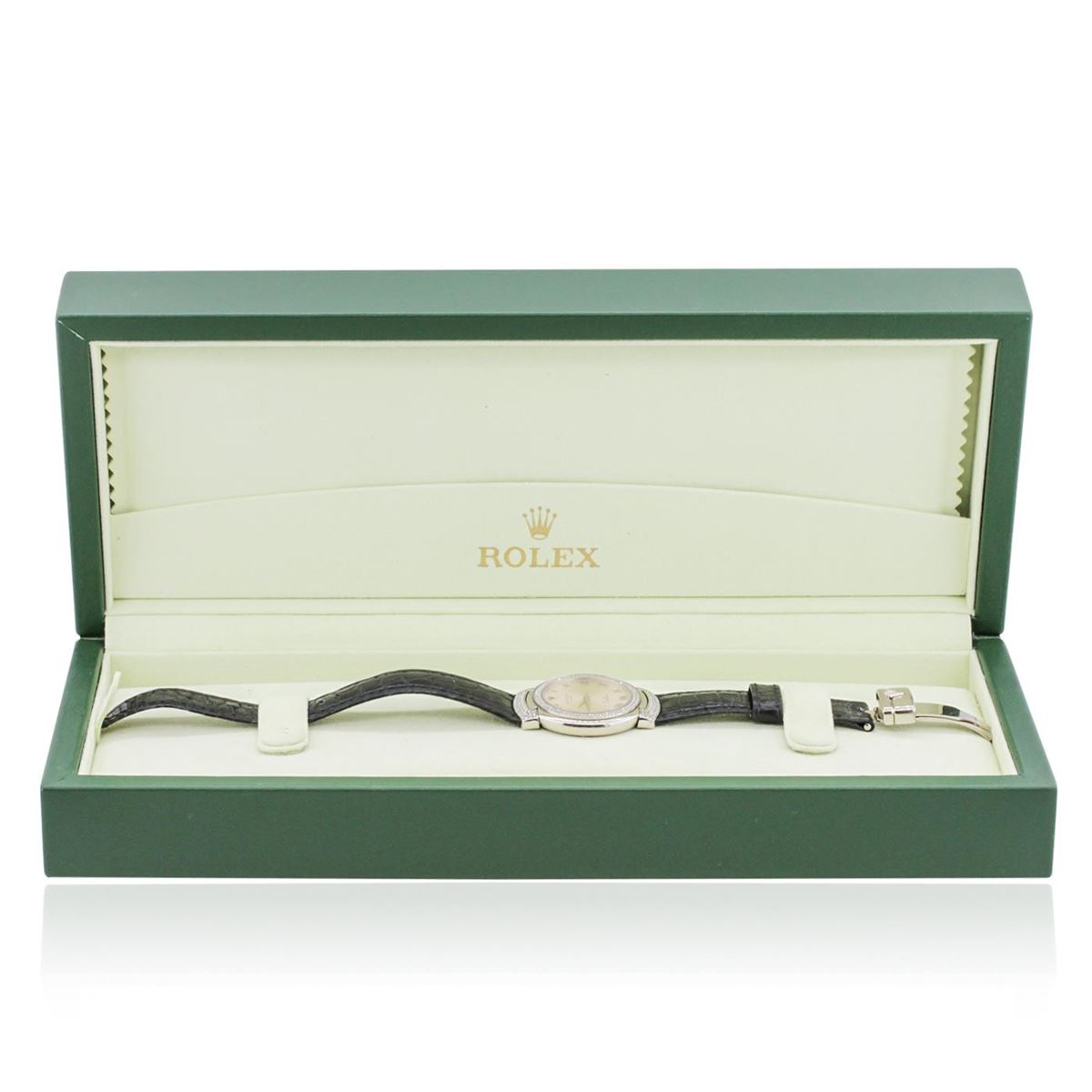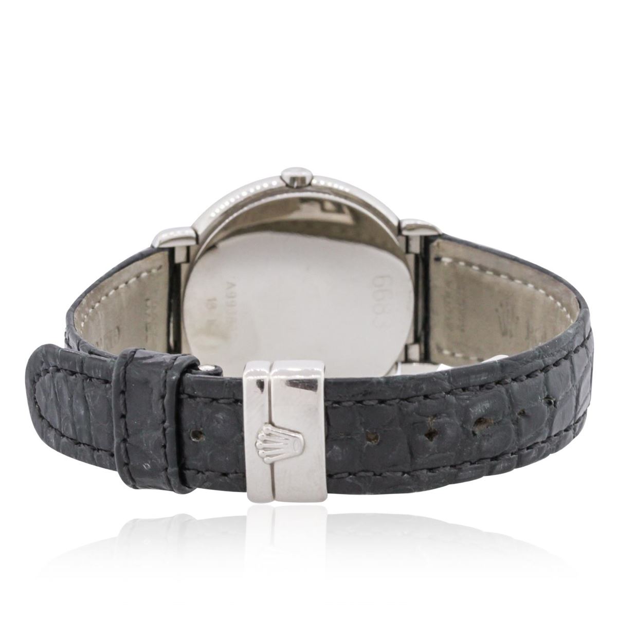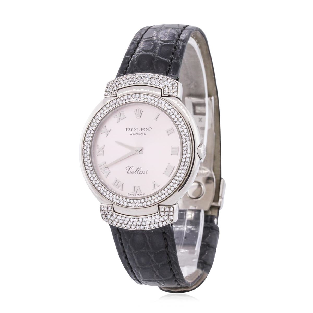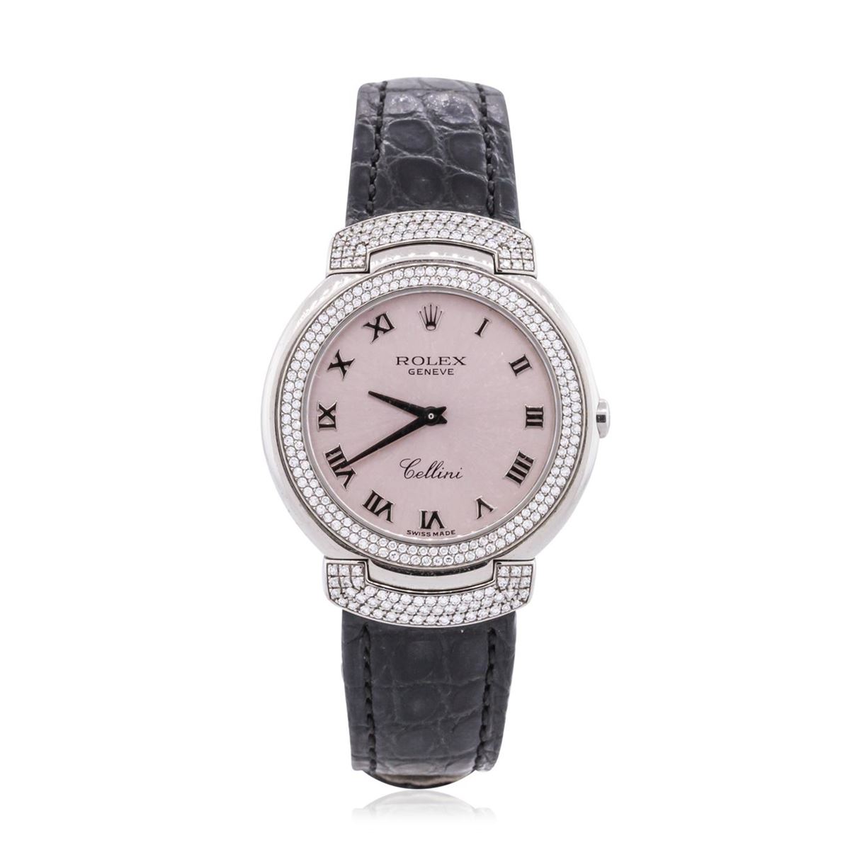 One, Rolex Cellini Cellissima wristwatch, electronically tested 18KT white gold, Case: 33mm diameter, Case Back: engraved with the manufacturers ID numbers, Bezel: diamond set, Logo'd Crown: Crystal: synthetic sapphire, Circa 1999.Movement: quartz, Dial: Pink, with pointed hands and Roman numerals, signed Rolex Cellini, Bracelet: Rolex, saddle stitched crocodile strap, 18KT white gold Buckle: Rolex concealed deployment clasp, Condition: G-5 fine. Seven and one half inch length, adjustable. Containing: Two Hundred Seventy Two single cut diamonds, approximate total weight equals 1.00ct. Set & graded in the bezel, and the case lugs. Clarity VS-1 Average. Color: F - G. Total Weight of Diamonds 1.00ct. Total Weight of Watch 58.40 grams. AIG Appraised at $19,750.00.