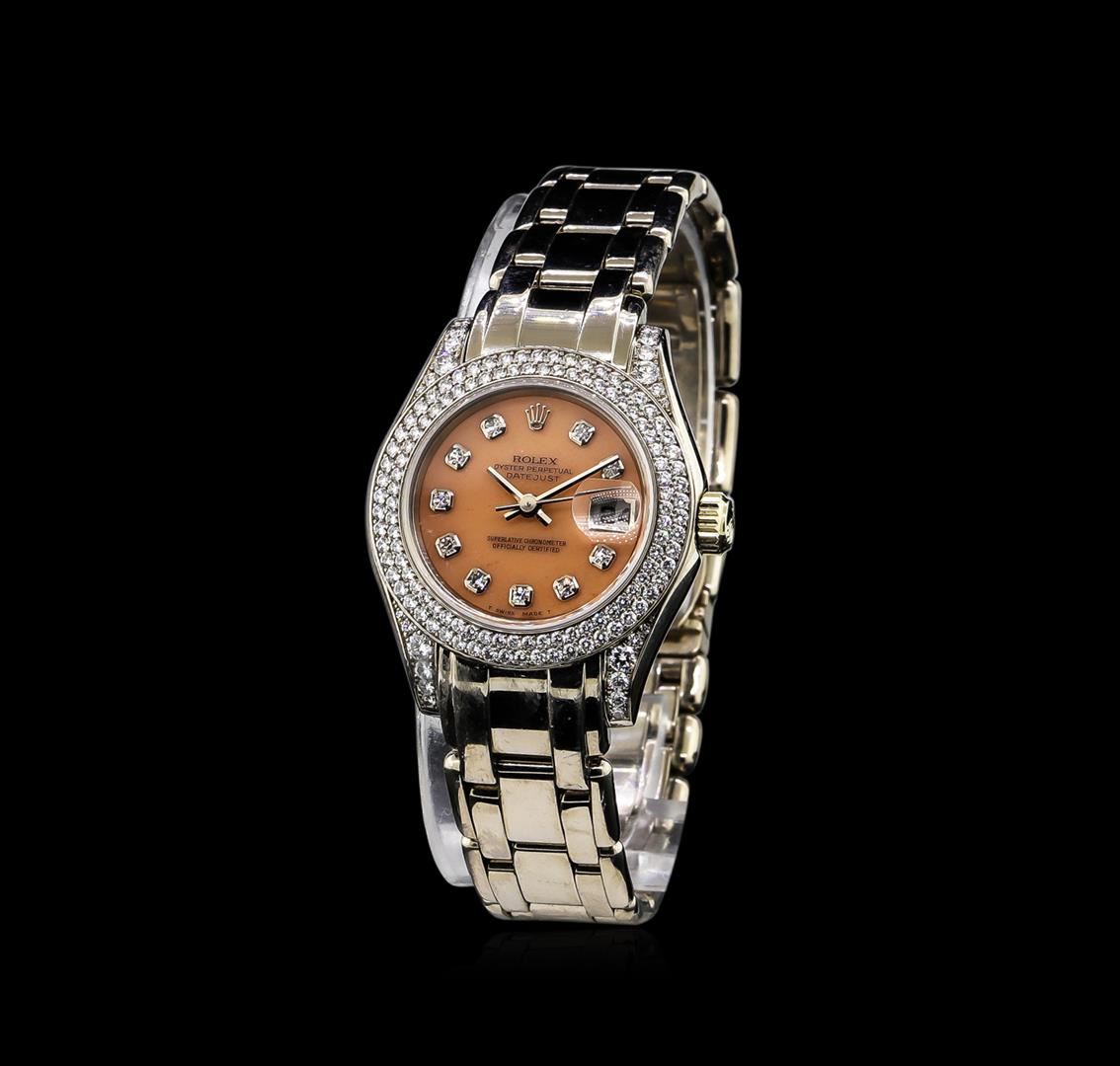One ladies, hand crafted & machine milled Rolex Masterpiece DateJust, model wristwatch electronically tested 18KT White gold, Swiss & Rolex Hallmarked Case: 29mm oyster, Water resistant: 100 meters / 330 feet. Scalloped Rolex logo'd Crown: twinlock, double water proof system, Factory Bezel: diamond set, Case Lugs: customized with diamonds, Rolex Hallmarked Crystal: synthetic sapphire cyclops lens. Circa 1995. Movement: superlative chronometer automatic. Rolex signed Dial: Pink mother of pearl, with baton hands and raised diamond markers, Date Window: 3 o'clock position, quick set, Date Wheel: Ivory color, Rolex Bracelet: 18KT White gold Pearlmaster links, Condition: G-6 Extra Fine. Bright polish finish. Seven and one half inch length. Four removable links. Swiss Hallmarked Rolex concealed deployment clasp, with logo. Containing: Approximately One Hundred Thirty Eight round brilliant cut diamonds, estimated total weight equals 1.44ct. Set & graded in the case lugs & bezel. Clarity VVS-2 to VS-1. Color: F - H. Total Weight of Diamonds 1.44ct. Total Weight of Watch 111.26gm. AIG Appraised at $31,000.00.