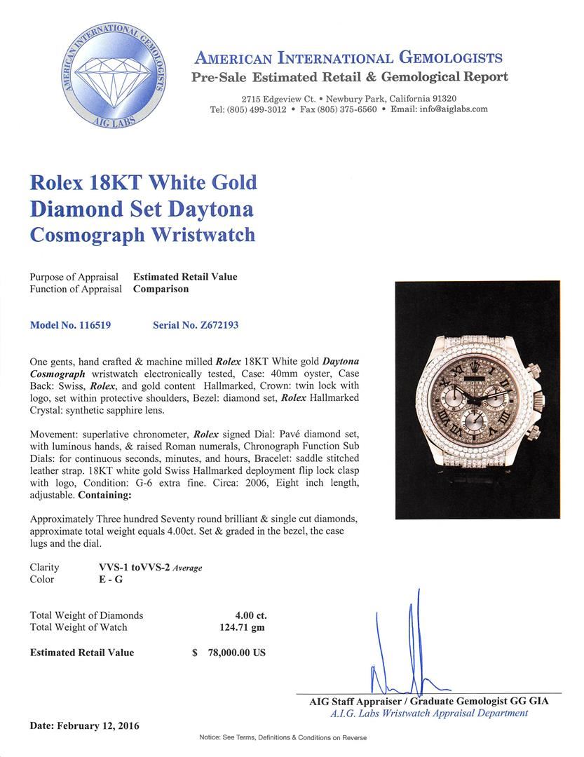 One gents, hand crafted & machine milled Rolex 18KT White gold Daytona Cosmograph wristwatch electronically tested, Case: 40mm oyster, Case Back: Swiss, Rolex, and gold Hallmarked, Crown: twin lock with logo, set within protective shoulders, Bezel: diamond set, Rolex Hallmarked Crystal: synthetic sapphire lens. Movement: superlative chronometer, Rolex signed Dial: Pave diamond set, with luminous hands, & raised Roman numerals, Chronograph Function Sub Dials: for continuous seconds, minutes, and hours, Bracelet: saddle stitched leather strap. 18KT white gold Swiss Hallmarked deployment flip lock clasp with logo, Condition: G-6 extra fine. Circa: 2006, Eight inch length, adjustable. Containing: Approximately Three hundred Seventy round brilliant & single cut diamonds, approximate total weight equals 4.00ct. Set & graded in the bezel, the case lugs and the dial. Clarity VVS-1 toVVS-2 Average. Color: E - G. Total Weight of Diamonds 4.00ct. Total Weight of Watch124.71gm. AIG Appraised at $78,000.00.