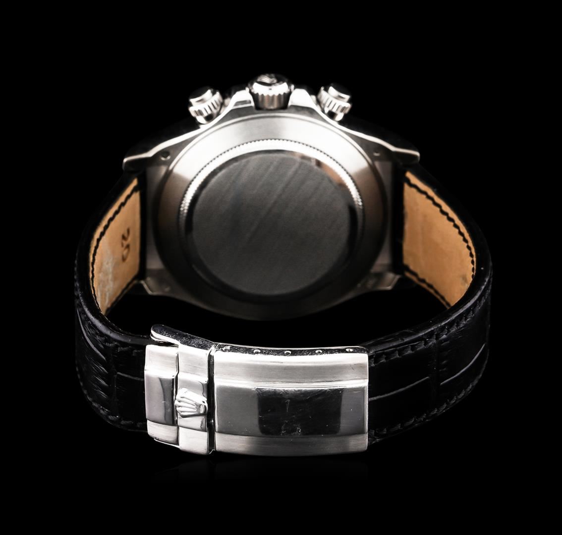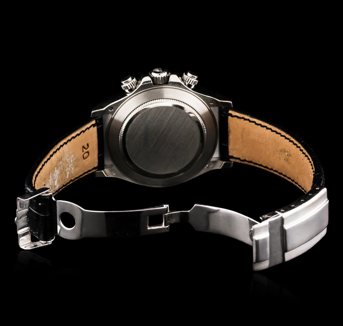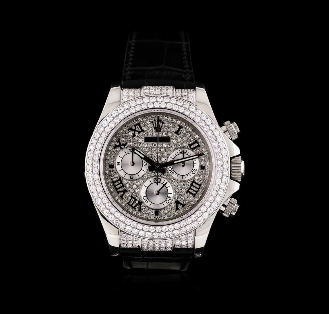 One gents, hand crafted & machine milled Rolex 18KT White gold Daytona Cosmograph wristwatch electronically tested, Case: 40mm oyster, Case Back: Swiss, Rolex, and gold Hallmarked, Crown: twin lock with logo, set within protective shoulders, Bezel: diamond set, Rolex Hallmarked Crystal: synthetic sapphire lens. Movement: superlative chronometer, Rolex signed Dial: Pave diamond set, with luminous hands, & raised Roman numerals, Chronograph Function Sub Dials: for continuous seconds, minutes, and hours, Bracelet: saddle stitched leather strap. 18KT white gold Swiss Hallmarked deployment flip lock clasp with logo, Condition: G-6 extra fine. Circa: 2006, Eight inch length, adjustable. Containing: Approximately Three hundred Seventy round brilliant & single cut diamonds, approximate total weight equals 4.00ct. Set & graded in the bezel, the case lugs and the dial. Clarity VVS-1 toVVS-2 Average. Color: E - G. Total Weight of Diamonds 4.00ct. Total Weight of Watch124.71gm. AIG Appraised at $78,000.00.