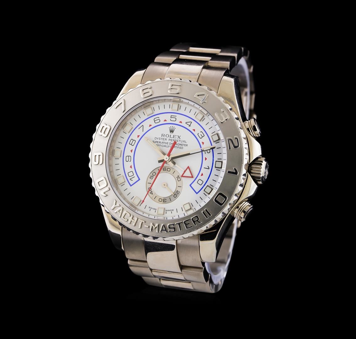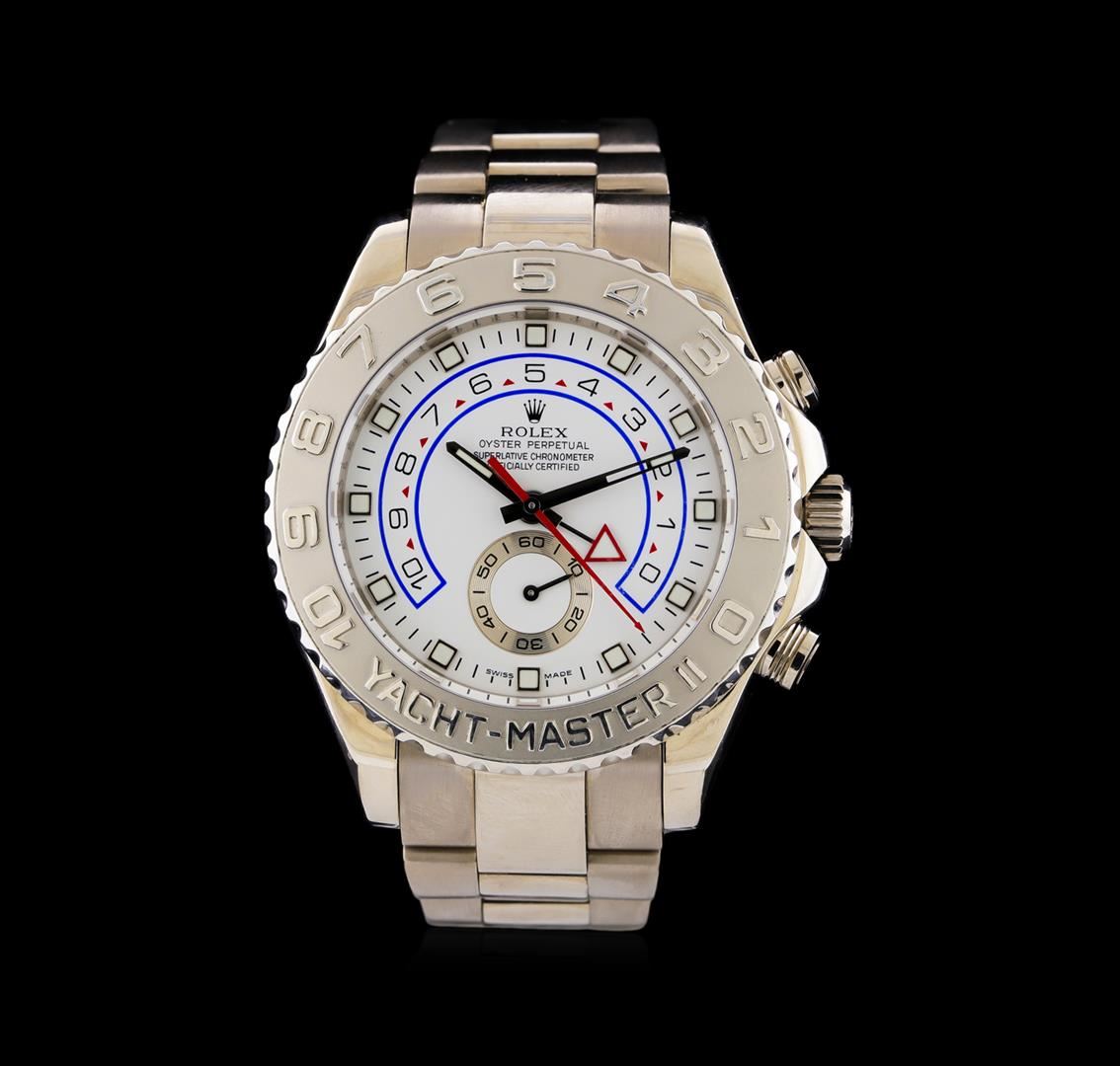 One Rolex Yacht-Master men's watch featuring: Case: 18KT white gold. Bezel: 90 degree bi-directional rotatable. Crystal: Sapphire. Crown: Triplock triple waterproof screw-down. Dial: White color; silver tone hour and minute hands; red second hand; Arabic; minute markers around outer rim. Features: Programmable countdown function with mechanical memory; water resistant to 100 meters/300 feet. Bracelet: 18KT white gold. Condition: Barely noticeable surface scratches on bracelet/clasp, but otherwise there are no major signs of wear.