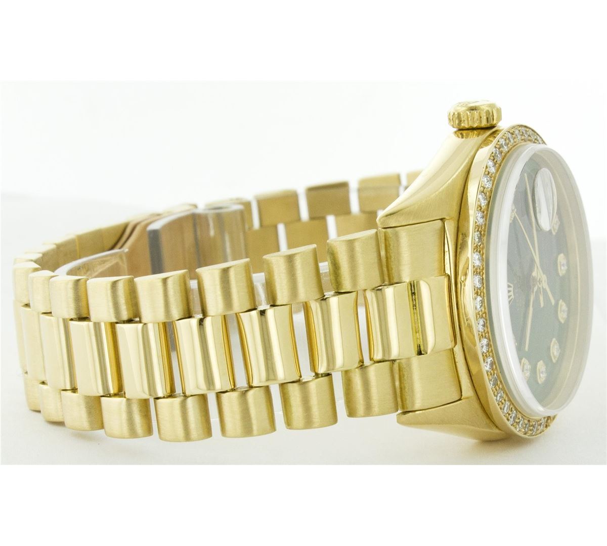 One Mens Rolex Day Date President Polished, Serviced & Electronically Tested, Yellow Gold Case:36mm. Yellow Gold Crown, Bezel: Custom 18K Yellow Gold Beadset Diamond Bezel, Diamond Count: 44Diamonds Total Weight 1.00 Carat, Clarity: SI-VS, Color: G to H. Custom Crystal: Synthetic Sapphire Cyclops Lens. Movement: Automatic Winding Movement Caliber 3055. Custom Dial: Diamond Dial With Small Track, (10 Diamonds In Dial) G To H In Color, Clarity: SI-VS. Date Window: 3 O'Clock Position Date Display, Day Display: 12 O'Clock Position. Quickset, Model: 18038. Condition: G-6 Extra Fine. Bracelet: Yellow Gold President. Bright Polish. 6.5 Inch Length, Standard President Hidden Clasp, With Rolex Logo.