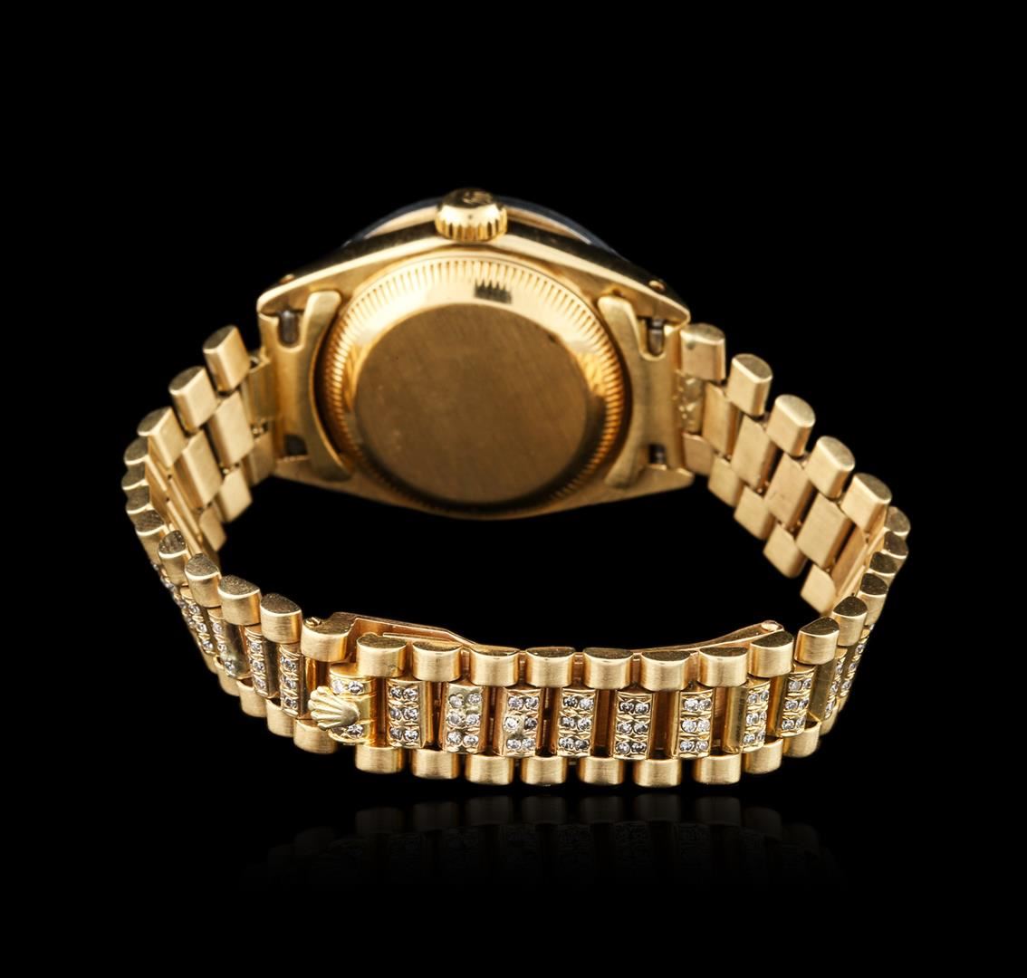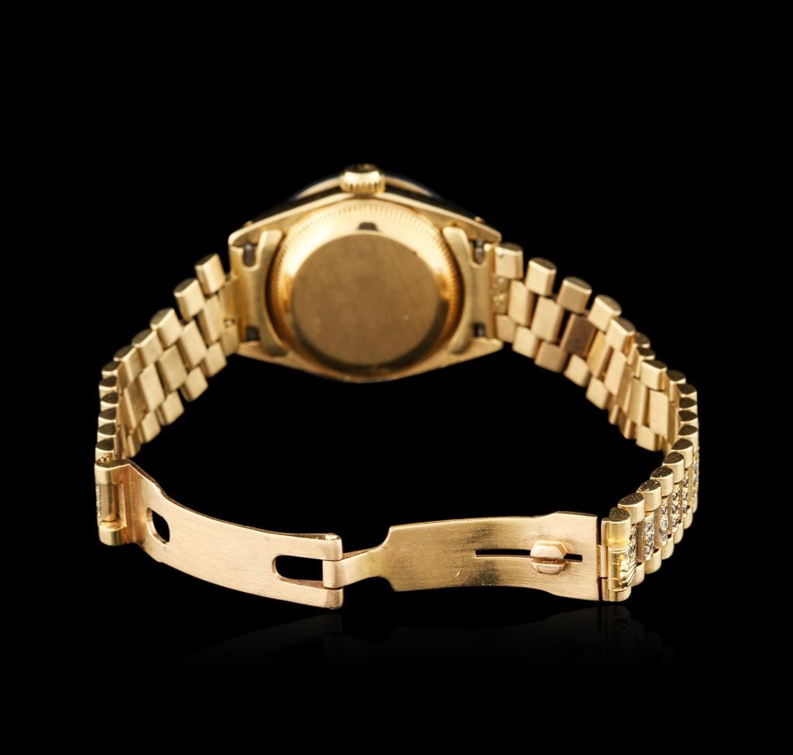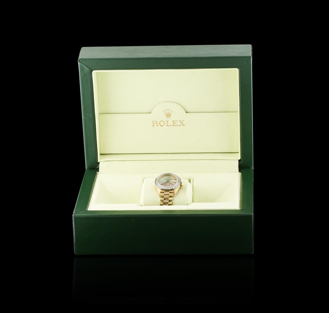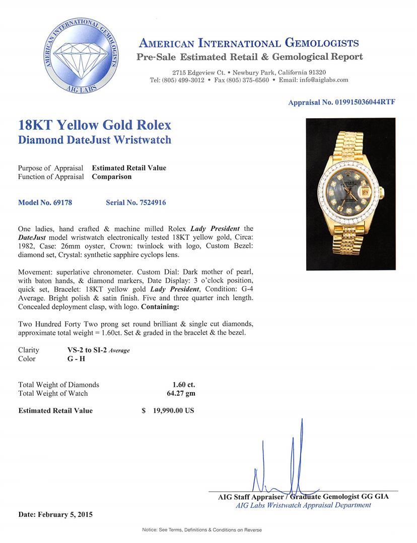 One ladies, hand crafted & machine milled Rolex Lady President the DateJust model wristwatch electronically tested 18KT yellow gold, Circa: 1982, Case: 26mm oyster, Crown: twinlock with logo, Custom Bezel: diamond set, Crystal: synthetic sapphire cyclops lens. Movement: superlative chronometer. Custom Dial: Dark mother of pearl, with baton hands, & diamond markers, Date Display: 3 o'clock position, quick set, Bracelet: 18KT yellow gold Lady President, Condition: G-4 Average. Bright polish & satin finish. Five and three quarter inch length. Concealed deployment clasp, with logo. Containing: Two Hundred Forty Two prong set round brilliant & single cut diamonds, approximate total weight = 1.60ct. Set & graded in the bracelet & the bezel. Clarity VS-2 to SI-2 Average. Color: G - H. Total Weight of Diamonds 1.60ct. Total Weight of Watch 64.27 grams. AIG Appraised at $19,990.00.
