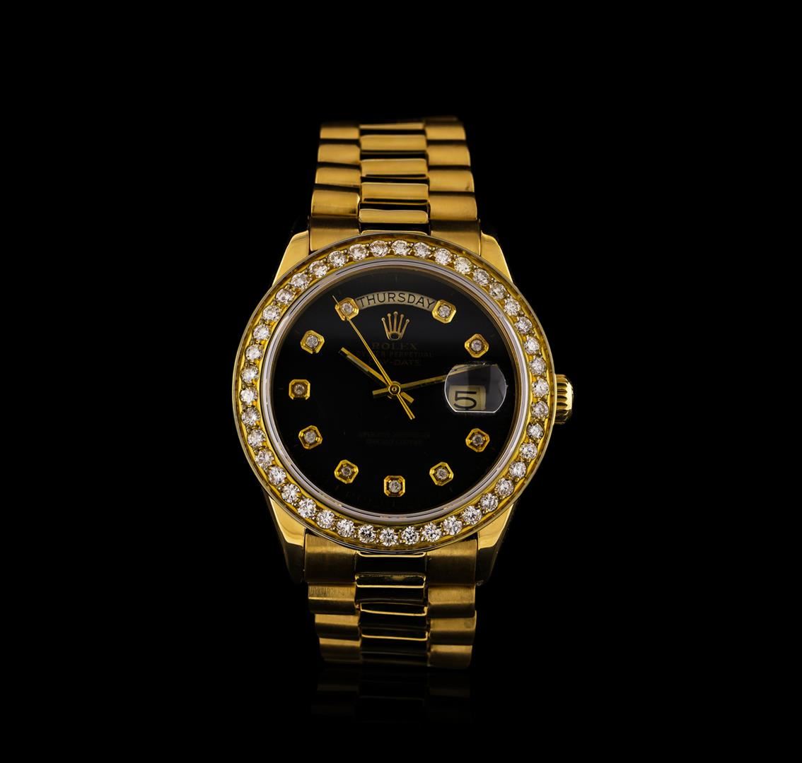 One gents, hand crafted & machine milled Rolex DayDate Model wristwatch electronically tested 18KT yellow gold, Case: 36mm oyster, Crown: twin lock with logo, Custom Bezel: diamond set, Custom Crystal: synthetic sapphire cyclops lens, Circa 1969. Movement: superlative chronometer, Custom Dial: Flat Black color, with baton hands, & diamond markers, Calendar: non-quick set, Bracelet: 18KT yellow gold, bright polish & brushed finish, Condition: G-4 Average. Seven inch length. Concealed deployment clasp, with logo Containing: Forty Two prong set round brilliant cut diamonds, approximate total weight equals 2.00ct. Set & graded in the bezel. Clarity: SI-1 to I-1. Color: G - I. Total Weight of Diamonds 2.00ct. Total Weight of Watch 119.52 grams. AIG Appraised at $23,990.00.