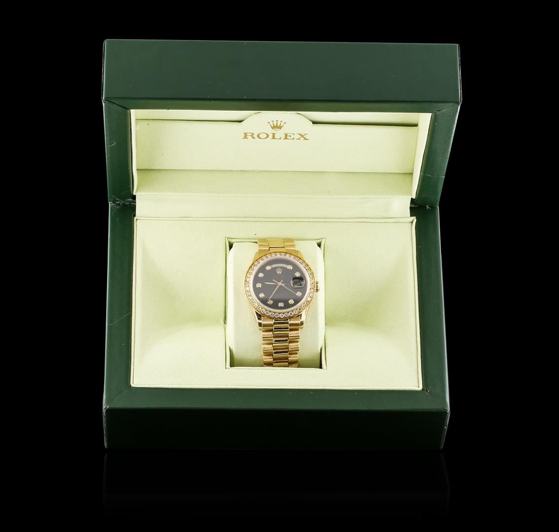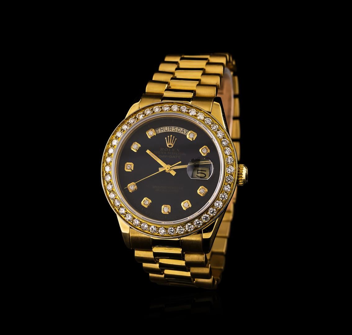 One gents, hand crafted & machine milled Rolex DayDate Model wristwatch electronically tested 18KT yellow gold, Case: 36mm oyster, Crown: twin lock with logo, Custom Bezel: diamond set, Custom Crystal: synthetic sapphire cyclops lens, Circa 1969. Movement: superlative chronometer, Custom Dial: Flat Black color, with baton hands, & diamond markers, Calendar: non-quick set, Bracelet: 18KT yellow gold, bright polish & brushed finish, Condition: G-4 Average. Seven inch length. Concealed deployment clasp, with logo Containing: Forty Two prong set round brilliant cut diamonds, approximate total weight equals 2.00ct. Set & graded in the bezel. Clarity: SI-1 to I-1. Color: G - I. Total Weight of Diamonds 2.00ct. Total Weight of Watch 119.52 grams. AIG Appraised at $23,990.00.
