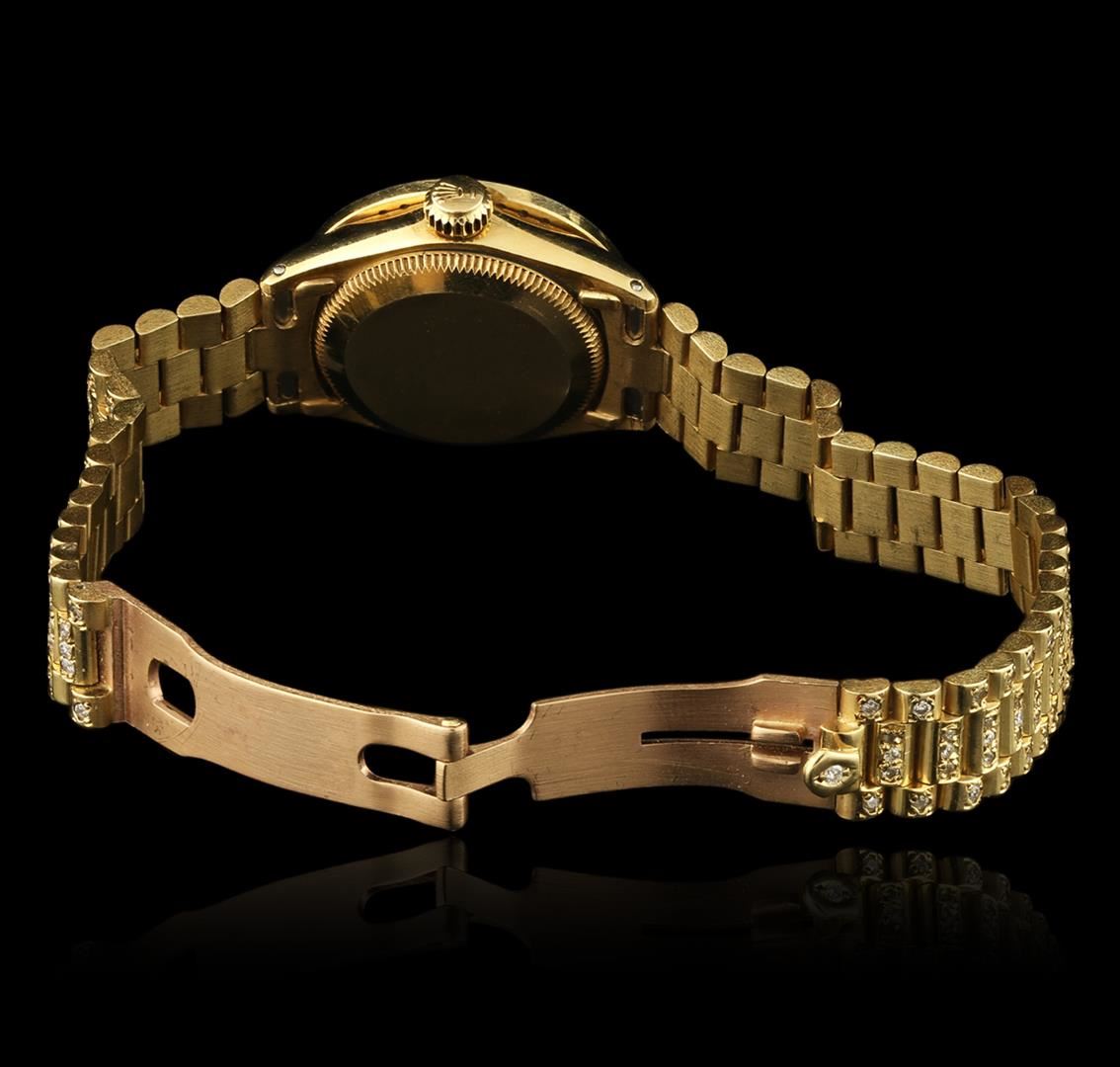 One ladies, hand crafted & machine milled Rolex customized DateJust Model wristwatch electronically tested 18KT yellow gold, Case: 26mm oyster, Crown: twinlock with logo, Custom Bezel: diamond set, Custom Crystal: acrylic cyclops lens. Movement: superlative chronometer automatic, Custom Dial: Champagne color, with baton hands, and diamond markers, Date Window: 3 o'clock position, non-quick set, Custom Italian Bracelet: 18KT yellow gold Super President style, Condition: G-4 Average. Circa: 1961, Bright polish & satin finish. Six and three quarter inch length. Concealed deployment clasp. Containing: Approximately Two Hundred Forty Three round brilliant cut diamonds, approximate total weight = 3.30ct. Set & graded in the bracelet, the bezel, and the dial. Clarity SI-2 to I-2. Color: G - I. Total Weight of Diamonds 3.30ct. Total Weight of Watch 72.99 grams. AIG Appraised at $18,990.00.