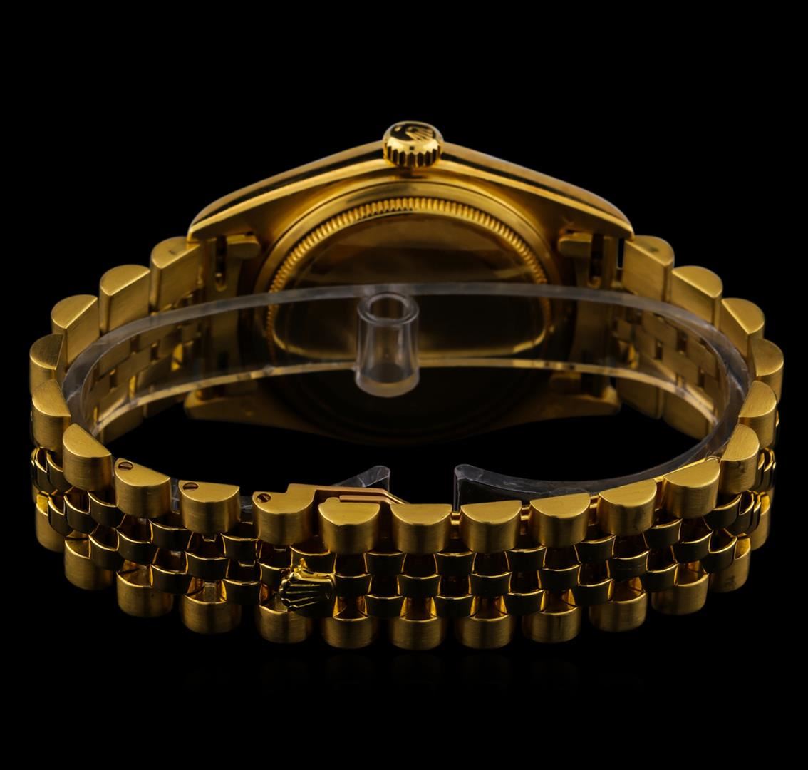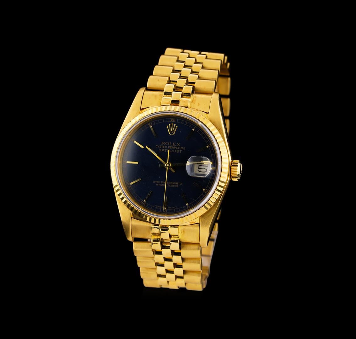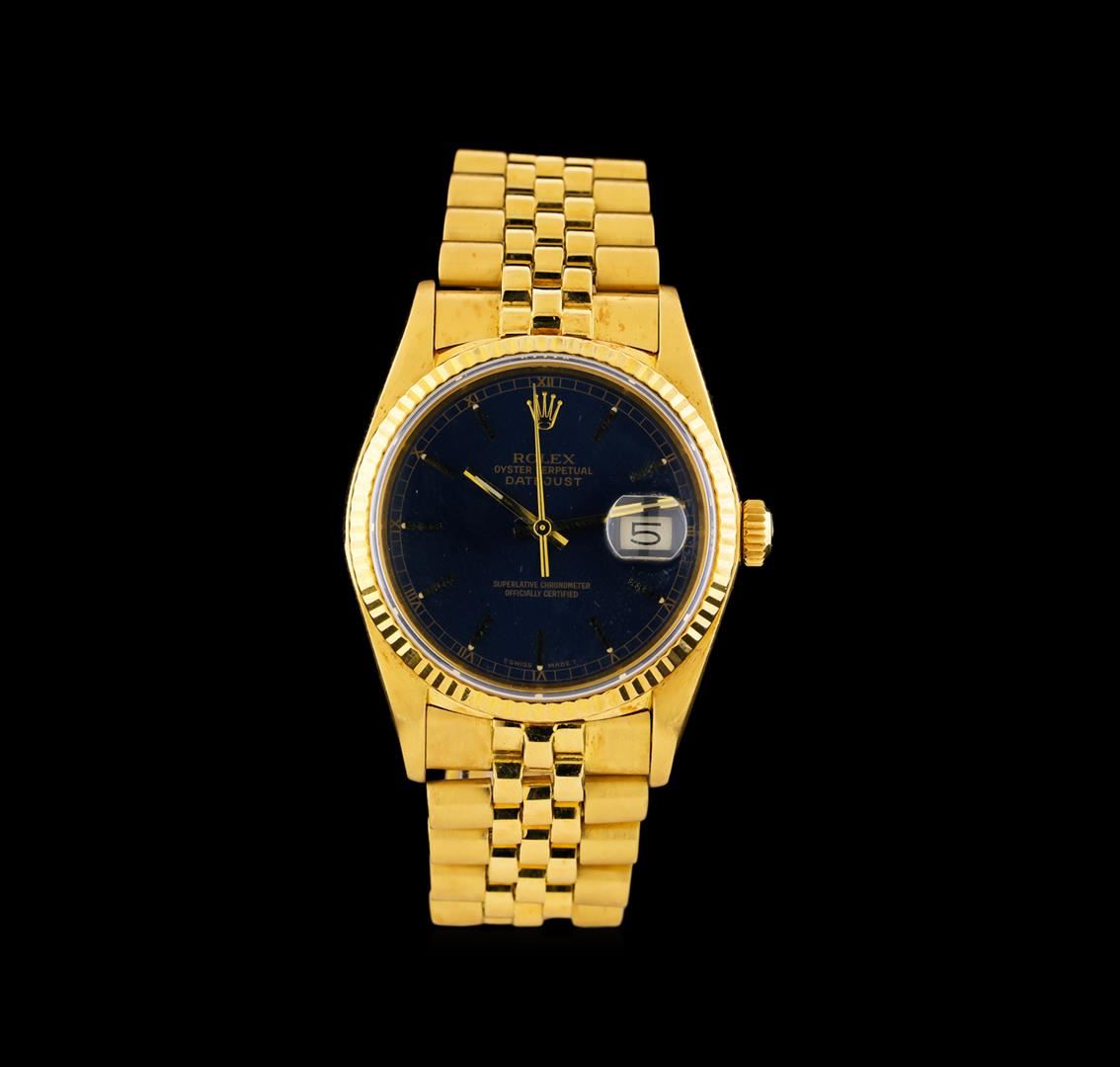 One Rolex DateJust men's watch featuring: Case: 18KT yellow gold. Bezel: 18KT yellow gold fluted. Crystal: Scratch-resistant sapphire. Dial: Blue color; gold tone hour markers. Features: Date window located at the 3 o'clock position. Bracelet: 18KT yellow gold.