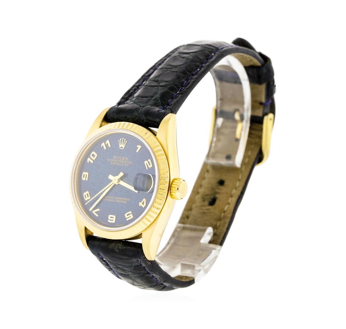 One, hand crafted & machine milled Rolex Mid-Size DateJust wristwatch electronically tested, 18KT Yellow Gold Case: 30mm oyster, 18KT yellow gold Rolex Signature Crown: twinlock with high relief logo, 18KT yellow gold Bezel: fluted, Crystal: synthetic sapphire cyclops lens. Movement: superlative chronometer, Rolex signed Jubilee Dial: Blue color, with baton hands and raised numerals, Date Window: Champagne color, 3 o'clock position quick set, Circa: 1990, Rolex Hallmarked Bracelet: saddle stitched leather strap, Condition: G-5 Fine. Seven and three quarter inch length, adjustable. Non-Rolex gold tone buckle. Total Weight of Watch 49.38gm. AIG Appraised at $7,550.00.