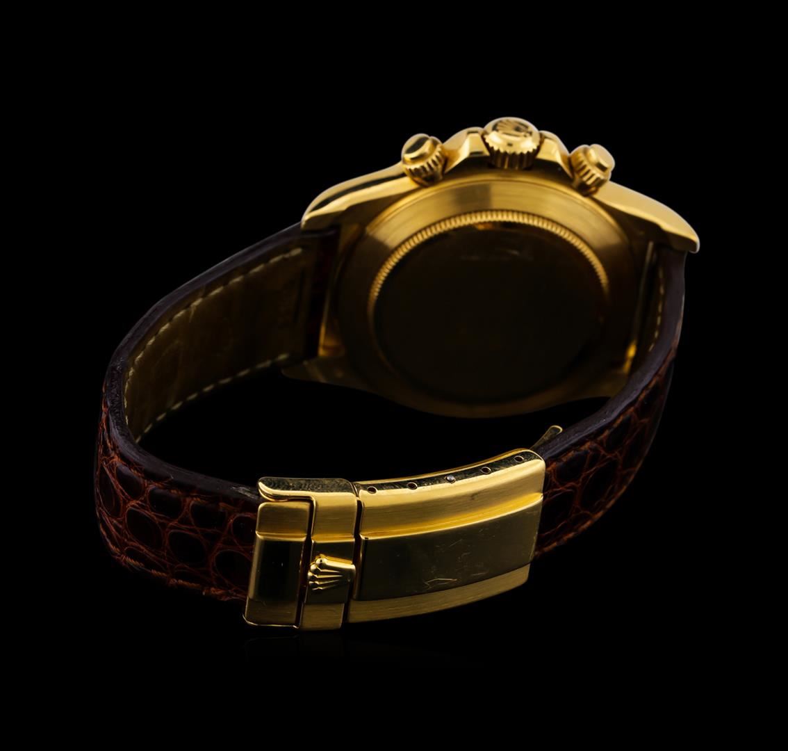 One Rolex Daytona men's watch featuring: Movement: Automatic. Case: 18KT yellow gold. Bezel: 18KT yellow gold engraved tachymeter. Crystal: Scratch-resistant sapphire. Dial: White color; gold hour numerals; gold sub-dials. Features: Chronograph; waterproof screw-down crown. Bracelet: Brown Rolex genuine crocodile strap with 18KT yellow gold deployment clasp. Condition: Barely noticeable surface scratches on clasp, but otherwise there are no major signs of wear.