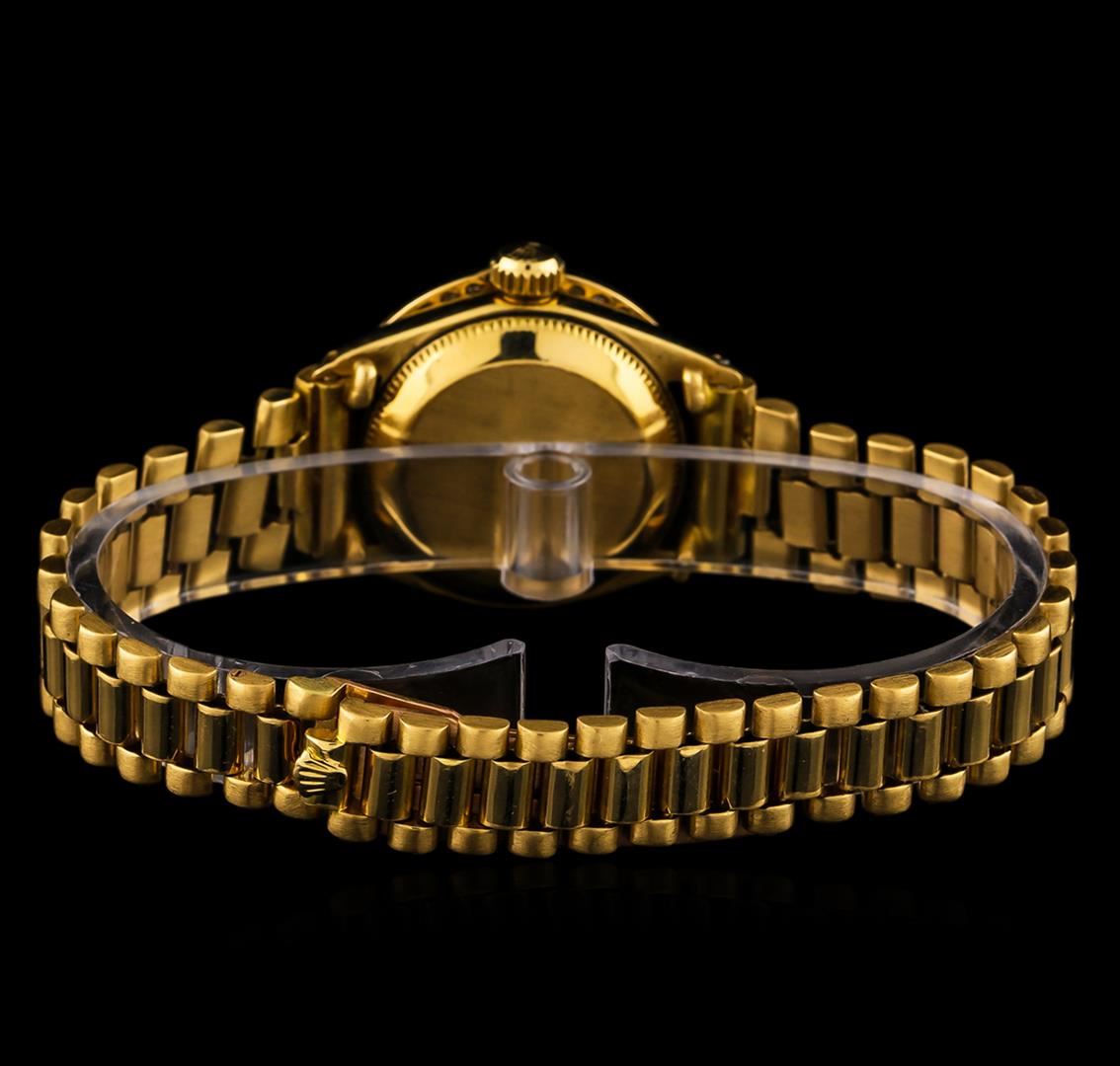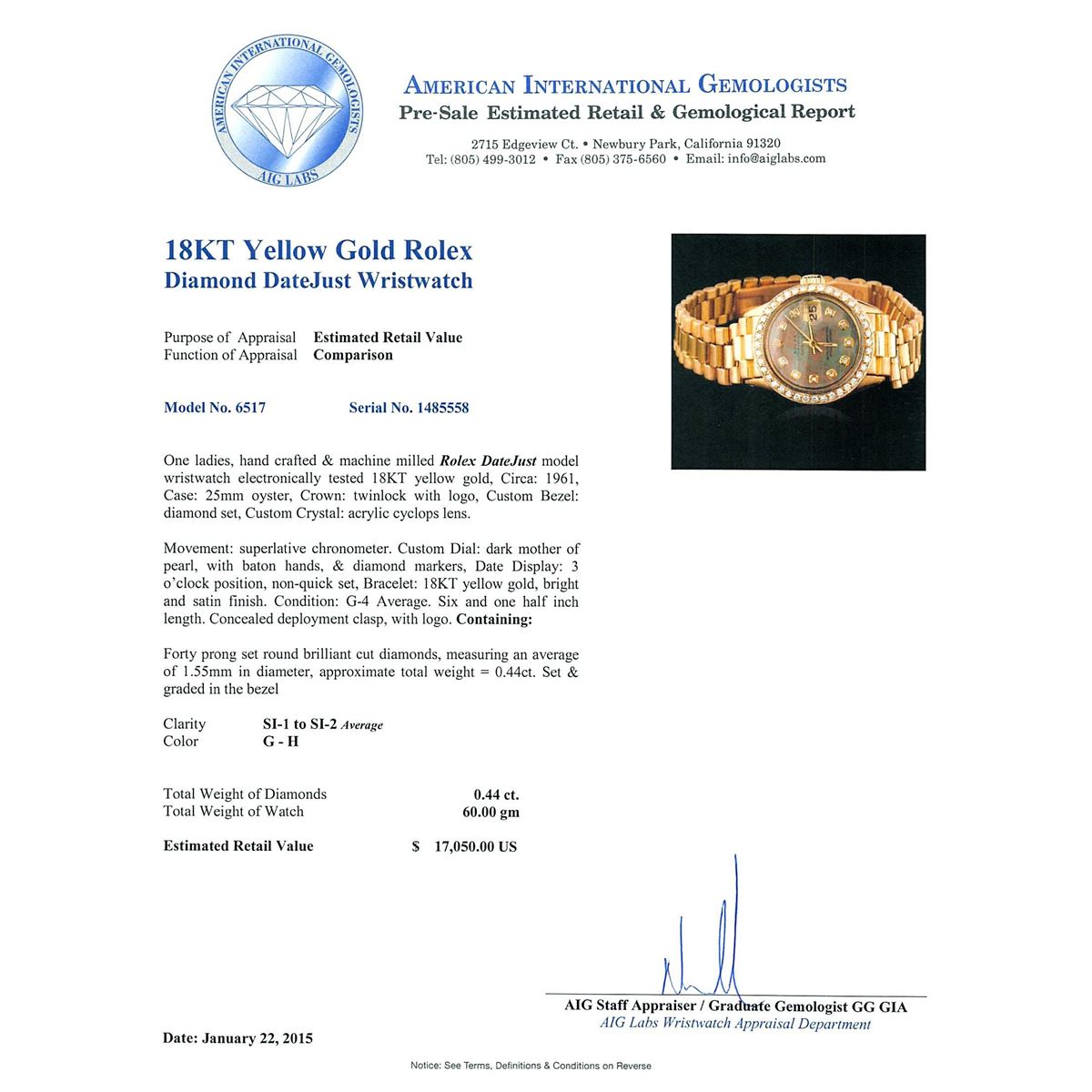 One ladies, hand crafted & machine milled Rolex DateJust model wristwatch electronically tested 18KT yellow gold, Circa: 1961, Case: 25mm oyster, Crown: twinlock with logo, Custom Bezel: diamond set, Custom Crystal: acrylic cyclops lens. Movement: superlative chronometer. Custom Dial: dark mother of pearl, with baton hands, & diamond markers, Date Display: 3 o'clock position, non-quick set, Bracelet: 18KT yellow gold, bright and satin finish. Condition: G-4 Average. Six and one half inch length. Concealed deployment clasp, with logo. Containing: Forty prong set round brilliant cut diamonds, measuring an average of 1.55mm in diameter, approximate total weight = 0.44ct. Set & graded in the bezel Clarity SI-1 to SI-2 Average. Color: G - H. Total Weight of Diamonds 0.44ct. Total Weight of Watch 60.00 grams. AIG Appraised at $17,050.00.