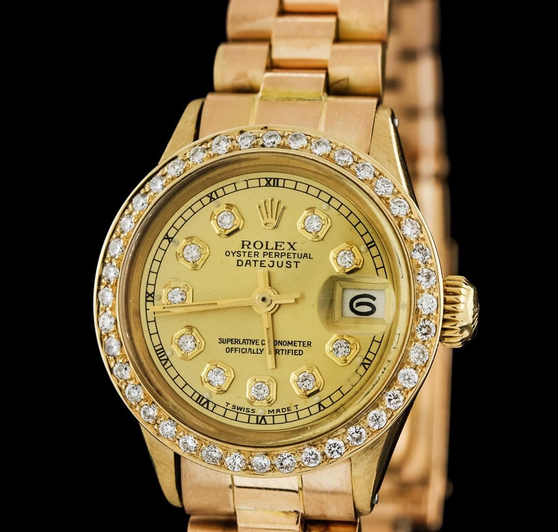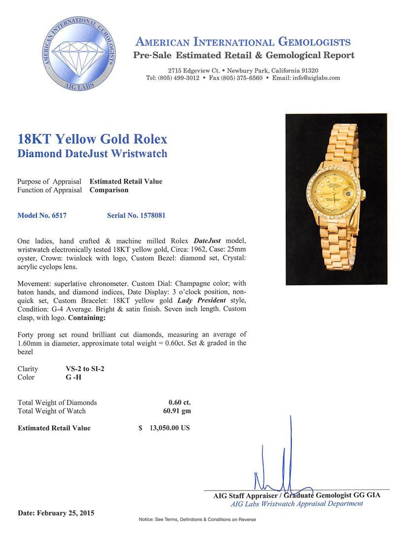 One ladies, hand crafted & machine milled Rolex DateJust model, wristwatch electronically tested 18KT yellow gold, Circa: 1962, Case: 25mm oyster, Crown: twinlock with logo, Custom Bezel: diamond set, Crystal: acrylic cyclops lens. Movement: superlative chronometer. Custom Dial: Champagne color; with baton hands, and diamond indices, Date Display: 3 o'clock position, non-quick set, Custom Bracelet: 18KT yellow gold Lady President style, Condition: G-4 Average. Bright & satin finish. Seven inch length. Custom clasp, with logo. Containing: Forty prong set round brilliant cut diamonds, measuring an average of 1.60mm in diameter, approximate total weight = 0.60ct. Set & graded in the bezel Clarity VS-2 to SI-2. Color: G -H. Total Weight of Diamonds 0.60ct. Total Weight of Watch 60.91 grams. AIG Appraised at $13,050.00.