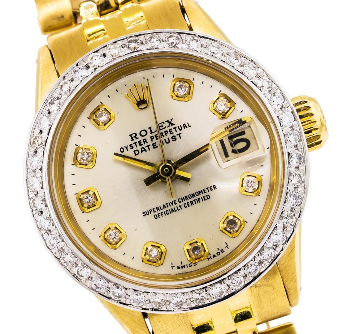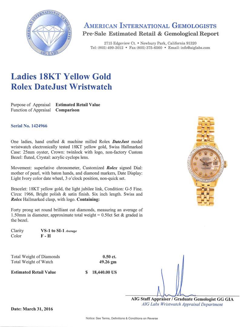 One ladies, hand crafted & machine milled Rolex DateJust model wristwatch electronically tested 18KT yellow gold, Swiss Hallmarked Case: 25mm oyster, Crown: twinlock with logo, non-factory Custom Bezel: fluted, Crystal: acrylic cyclops lens. Movement: superlative chronometer, Customized Rolex signed Dial: mother of pearl, with baton hands, and diamond markers, Date Display: Light Ivory color date wheel, 3 o'clock position, non-quick set. Bracelet: 18KT yellow gold, the light jubilee link, Condition: G-5 Fine. Circa: 1966, Bright polish & satin finish. Six inch length. Swiss and Rolex Hallmarked clasp, with logo. Containing: Forty prong set round brilliant cut diamonds, measuring an average of 1.50mm in diameter, approximate total weight = 0.50ct Set & graded in the bezel. Clarity VS-1 to SI-1 Average. Color: F - H. Total Weight of Diamonds 0.50ct. Total Weight of Watch 49.26gm. AIG Appraised at $18,440.00.